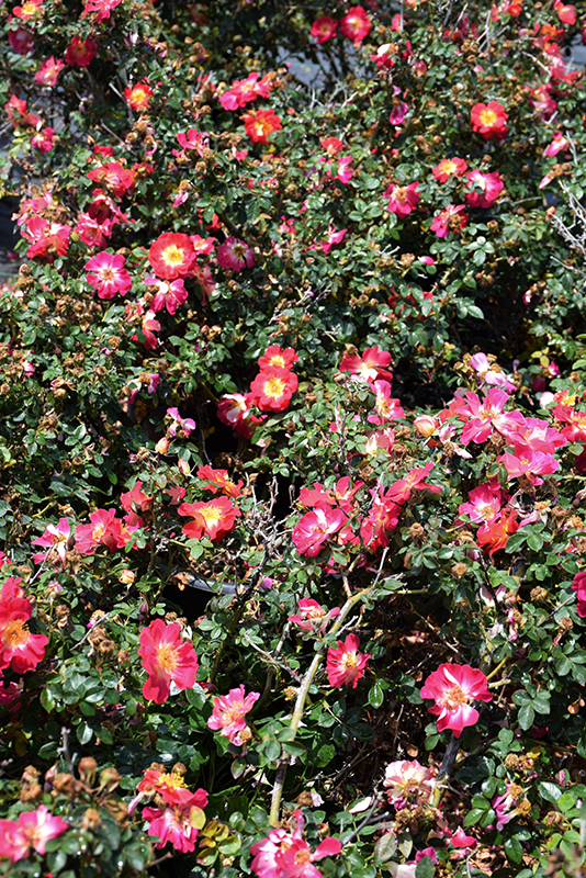 Hardiness Zone: 6a Group/Class: Groundcover Rose Description: This variety has small healthy dark green foliage and blooms that are deep orange-red with a gold center and a strong apple fragrance; a repeat blooming groundcover great for containers, garden banks, and large groundcover areas Ornamental Features Ralph's Creeper Rose is bathed in stunning fragrant semi-double scarlet flowers with gold eyes and a white reverse at the ends of the branches from early summer to mid fall. The flowers are excellent for cutting. It has dark green deciduous foliage. The glossy oval compound leaves do not develop any appreciable fall color. Landscape Attributes Ralph's Creeper Rose is a multi-stemmed deciduous shrub with a mounded form. Its average texture blends into the landscape, but can be balanced by one or two finer or coarser trees or shrubs for an effective composition. This shrub will require occasional maintenance and upkeep, and is best pruned in late winter once the threat of extreme cold has passed. It is a good choice for attracting bees to your yard. Gardeners should be aware of the following characteristic(s) that may warrant special consideration; Ralph's Creeper Rose is recommended for the following landscape applications; Planting & Growing Ralph's Creeper Rose will grow to be about 30 inches tall at maturity, with a spread of 5 feet. It tends to fill out right to the ground and therefore doesn't necessarily require facer plants in front. It grows at a fast rate, and under ideal conditions can be expected to live for approximately 30 years. This shrub should only be grown in full sunlight. It does best in average to evenly moist conditions, but will not tolerate standing water. It is not particular as to soil type or pH. It is highly tolerant of urban pollution and will even thrive in inner city environments. This particular variety is an interspecific hybrid.