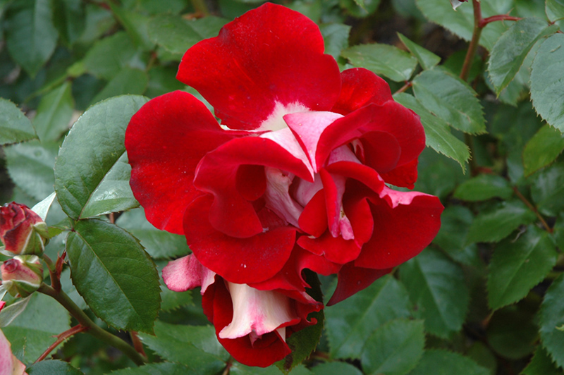 Hardiness Zone: 4b Group/Class: Floribunda Rose Description: Exciting clusters of blooms featuring scarlet petals with striking white reverses; flower petals open in a pinwheel fashion, which heightens the stunning visual impact this variety will create along walkways, borders, or in the garden Ornamental Features Topsy Turvy Rose features showy clusters of lightly-scented double scarlet flowers with a white reverse at the ends of the branches from late spring to early fall. The flowers are excellent for cutting. It has dark green deciduous foliage which emerges dark red in spring. The glossy oval compound leaves do not develop any appreciable fall color. Landscape Attributes Topsy Turvy Rose is a multi-stemmed deciduous shrub with an upright spreading habit of growth. Its average texture blends into the landscape, but can be balanced by one or two finer or coarser trees or shrubs for an effective composition. This shrub will require occasional maintenance and upkeep, and is best pruned in late winter once the threat of extreme cold has passed. It is a good choice for attracting bees to your yard. Gardeners should be aware of the following characteristic(s) that may warrant special consideration; Topsy Turvy Rose is recommended for the following landscape applications; Planting & Growing Topsy Turvy Rose will grow to be about 4 feet tall at maturity, with a spread of 4 feet. It tends to fill out right to the ground and therefore doesn't necessarily require facer plants in front. It grows at a fast rate, and under ideal conditions can be expected to live for approximately 30 years. This shrub should only be grown in full sunlight. It does best in average to evenly moist conditions, but will not tolerate standing water. It is not particular as to soil type or pH. It is highly tolerant of urban pollution and will even thrive in inner city environments. This particular variety is an interspecific hybrid.