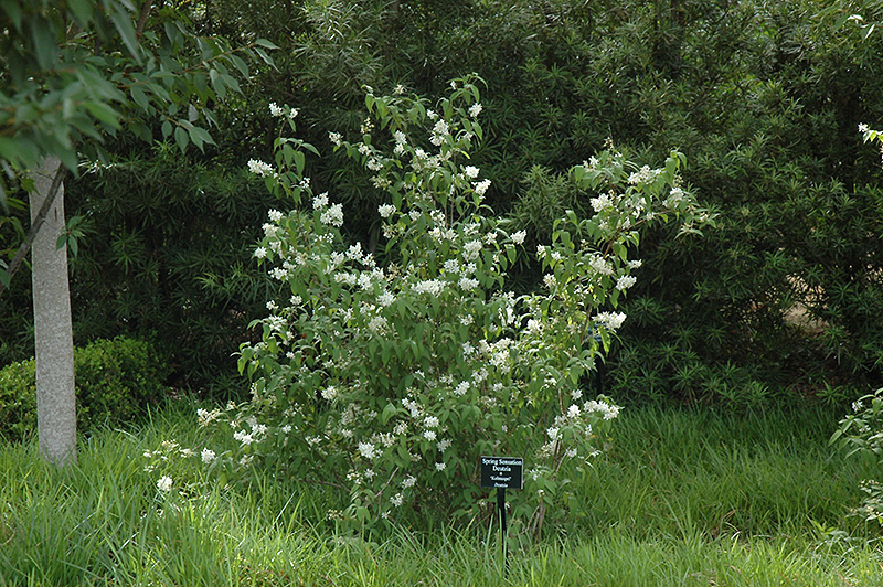 Hardiness Zone: 4b Description: Incredible clusters of small cupped elegant white flowers; rather unassuming the rest of the year, use where it can be complemented by other plants when not in bloom Ornamental Features Spring Sensation Deutzia is covered in stunning racemes of lightly-scented white cup-shaped flowers at the ends of the branches from mid to late spring. It has dark green deciduous foliage. The serrated oval leaves turn an outstanding burgundy in the fall. Landscape Attributes Spring Sensation Deutzia is a multi-stemmed deciduous shrub with a shapely form and gracefully arching branches. Its average texture blends into the landscape, but can be balanced by one or two finer or coarser trees or shrubs for an effective composition. This is a high maintenance shrub that will require regular care and upkeep, and should only be pruned after flowering to avoid removing any of the current season's flowers. It has no significant negative characteristics. Spring Sensation Deutzia is recommended for the following landscape applications; Planting & Growing Spring Sensation Deutzia will grow to be about 5 feet tall at maturity, with a spread of 5 feet. It tends to be a little leggy, with a typical clearance of 1 foot from the ground, and is suitable for planting under power lines. It grows at a slow rate, and under ideal conditions can be expected to live for approximately 20 years. This shrub should only be grown in full sunlight. It is very adaptable to both dry and moist locations, and should do just fine under average home landscape conditions. It is not particular as to soil type or pH. It is highly tolerant of urban pollution and will even thrive in inner city environments. This particular variety is an interspecific hybrid.