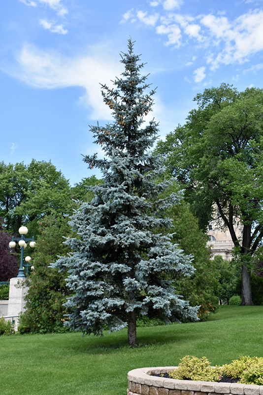 Hardiness Zone: 2a Other Names: Colorado Blue Spruce Description: A popular and much-sought-out evergreen accent tree with large stout branches and long, very pointy silvery-blue needles, far more reliable color than the species, a tree of great beauty and color; extremely hardy and rugged, makes an excellent windbreak Ornamental Features Blue Colorado Spruce is primarily valued in the landscape for its distinctively pyramidal habit of growth. It has attractive bluish-green evergreen foliage which emerges blue in spring. The needles are highly ornamental and remain bluish-green throughout the winter. The rough gray bark adds an interesting dimension to the landscape. Landscape Attributes Blue Colorado Spruce is a dense evergreen tree with a strong central leader and a distinctive and refined pyramidal form. Its average texture blends into the landscape, but can be balanced by one or two finer or coarser trees or shrubs for an effective composition. This is a relatively low maintenance tree. When pruning is necessary, it is recommended to only trim back the new growth of the current season, other than to remove any dieback. Deer don't particularly care for this plant and will usually leave it alone in favor of tastier treats. It has no significant negative characteristics. Blue Colorado Spruce is recommended for the following landscape applications; Planting & Growing Blue Colorado Spruce will grow to be about 50 feet tall at maturity, with a spread of 20 feet. It has a low canopy, and should not be planted underneath power lines. It grows at a slow rate, and under ideal conditions can be expected to live for 80 years or more. This tree should only be grown in full sunlight. It is very adaptable to both dry and moist growing conditions, but will not tolerate any standing water. It is considered to be drought-tolerant, and thus makes an ideal choice for xeriscaping or the moisture-conserving landscape. It is not particular as to soil type or pH, and is able to handle environmental salt. It is highly tolerant of urban pollution and will even thrive in inner city environments. This is a selection of a native North American species.