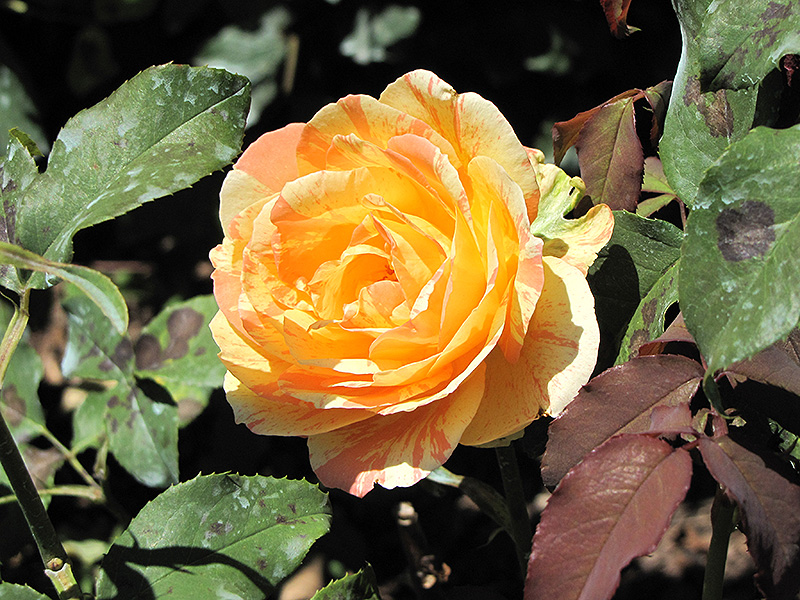 Hardiness Zone: 5b Group/Class: Hybrid Tea Rose Description: Stunning, large yellow and orange blooms with pink stripes, and a mild fragrance, complimenting rich deep green foliage; great for the garden, containers, or along borders Ornamental Features Rainbow Niagara Rose features showy lightly-scented double yellow flowers with orange overtones and pink stripes at the ends of the branches from early summer to mid fall. The flowers are excellent for cutting. It has dark green deciduous foliage. The glossy oval compound leaves do not develop any appreciable fall color. Landscape Attributes Rainbow Niagara Rose is a multi-stemmed deciduous shrub with an upright spreading habit of growth. Its average texture blends into the landscape, but can be balanced by one or two finer or coarser trees or shrubs for an effective composition. This is a high maintenance shrub that will require regular care and upkeep, and is best pruned in late winter once the threat of extreme cold has passed. Gardeners should be aware of the following characteristic(s) that may warrant special consideration; Rainbow Niagara Rose is recommended for the following landscape applications; Planting & Growing Rainbow Niagara Rose will grow to be about 4 feet tall at maturity, with a spread of 4 feet. It tends to fill out right to the ground and therefore doesn't necessarily require facer plants in front. It grows at a fast rate, and under ideal conditions can be expected to live for approximately 20 years. This shrub should only be grown in full sunlight. It does best in average to evenly moist conditions, but will not tolerate standing water. It is not particular as to soil type or pH. It is highly tolerant of urban pollution and will even thrive in inner city environments. This particular variety is an interspecific hybrid.