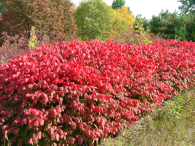 Hardiness Zone: 4a Other Names: Winged Euonymus, Burningbush Description: A spectacular and compact garden shrub which turns brilliant crimson red in fall, very showy; a shapely mounded growth habit and interesting corky wings on the branches; a very popular and adaptable landscape plant Ornamental Features Pipsqueak Winged Burning Bush has rich green deciduous foliage on a plant with a round habit of growth. The pointy leaves turn an outstanding crimson in the fall. It produces red capsules from early to late fall. The warty brown bark and harvest gold branches add an interesting dimension to the landscape. Landscape Attributes Pipsqueak Winged Burning Bush is a dense multi-stemmed deciduous shrub with a more or less rounded form. Its average texture blends into the landscape, but can be balanced by one or two finer or coarser trees or shrubs for an effective composition. This is a relatively low maintenance shrub, and can be pruned at anytime. It has no significant negative characteristics. Pipsqueak Winged Burning Bush is recommended for the following landscape applications; Planting & Growing Pipsqueak Winged Burning Bush will grow to be about 5 feet tall at maturity, with a spread of 6 feet. It tends to fill out right to the ground and therefore doesn't necessarily require facer plants in front, and is suitable for planting under power lines. It grows at a slow rate, and under ideal conditions can be expected to live for 50 years or more. This shrub performs well in both full sun and full shade. It is very adaptable to both dry and moist locations, and should do just fine under average home landscape conditions. It is not particular as to soil type or pH. It is highly tolerant of urban pollution and will even thrive in inner city environments. This is a selected variety of a species not originally from North America.