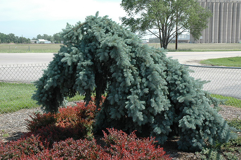 Hardiness Zone: 2b Other Names: Blue Colorado Spruce;Colorado Blue Spruce Description: A weeping and trailing spire-like tree, with dusty blue pointy needles held on sharply trailing branches, almost skirted in appearance; durable and very hardy, a most emphatic accent tree to say the least Ornamental Features Weeping Blue Spruce is primarily valued in the landscape or garden for its cascading habit of growth. It has attractive silvery blue evergreen foliage. The needles are highly ornamental and remain silvery blue throughout the winter. Landscape Attributes Weeping Blue Spruce is a dense evergreen dwarf tree with a strong central leader and a shapely form and gracefully arching branches. Its relatively fine texture sets it apart from other landscape plants with less refined foliage. This is a relatively low maintenance dwarf tree. When pruning is necessary, it is recommended to only trim back the new growth of the current season, other than to remove any dieback. Deer don't particularly care for this plant and will usually leave it alone in favor of tastier treats. It has no significant negative characteristics. Weeping Blue Spruce is ideal for use as a garden accent or patio feature, and is recommended for the following landscape applications; Planting & Growing Weeping Blue Spruce will grow to be about 10 feet tall at maturity, with a spread of 5 feet. It tends to be a little leggy, with a typical clearance of 1 foot from the ground, and is suitable for planting under power lines. It grows at a slow rate, and under ideal conditions can be expected to live for 70 years or more. This dwarf tree should only be grown in full sunlight. It is very adaptable to both dry and moist growing conditions, but will not tolerate any standing water. It is considered to be drought-tolerant, and thus makes an ideal choice for xeriscaping or the moisture-conserving landscape. It is not particular as to soil type or pH, and is able to handle environmental salt. It is highly tolerant of urban pollution and will even thrive in inner city environments. This is a selection of a native North American species. Weeping Blue Spruce is a fine choice for the yard, but it is also a good selection for planting in outdoor pots and containers. Because of its height, it is often used as a 'thriller' in the 'spiller-thriller-filler' container combination; plant it near the center of the pot, surrounded by smaller plants and those that spill over the edges. It is even sizeable enough that it can be grown alone in a suitable container. Note that when grown in a container, it may not perform exactly as indicated on the tag - this is to be expected. Also note that when growing plants in outdoor containers and baskets, they may require more frequent waterings than they would in the yard or garden.