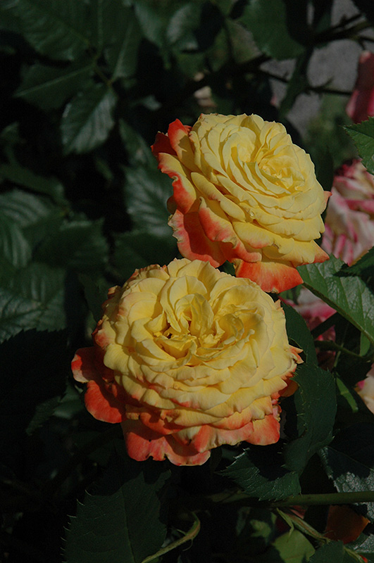Hardiness Zone: 5b Group/Class: Hybrid Tea Rose Description: This elegant variety presents full, sunny yellow blooms edged in bold coral-pink, a real show-stopper when in bloom; repeat blooms throughout summer; all roses need full sun and well-drained soil Ornamental Features Garden Joy Rose features showy fully double gold flowers with coral-pink edges at the ends of the branches from late spring to early fall. The flowers are excellent for cutting. It has dark green deciduous foliage. The glossy oval compound leaves do not develop any appreciable fall color. Landscape Attributes Garden Joy Rose is a multi-stemmed deciduous shrub with an upright spreading habit of growth. Its average texture blends into the landscape, but can be balanced by one or two finer or coarser trees or shrubs for an effective composition. This shrub will require occasional maintenance and upkeep, and is best pruned in late winter once the threat of extreme cold has passed. Gardeners should be aware of the following characteristic(s) that may warrant special consideration; Garden Joy Rose is recommended for the following landscape applications; Planting & Growing Garden Joy Rose will grow to be about 3 feet tall at maturity, with a spread of 32 inches. It tends to fill out right to the ground and therefore doesn't necessarily require facer plants in front. It grows at a medium rate, and under ideal conditions can be expected to live for approximately 20 years. This shrub should only be grown in full sunlight. It does best in average to evenly moist conditions, but will not tolerate standing water. It is not particular as to soil type or pH. It is somewhat tolerant of urban pollution. This particular variety is an interspecific hybrid.