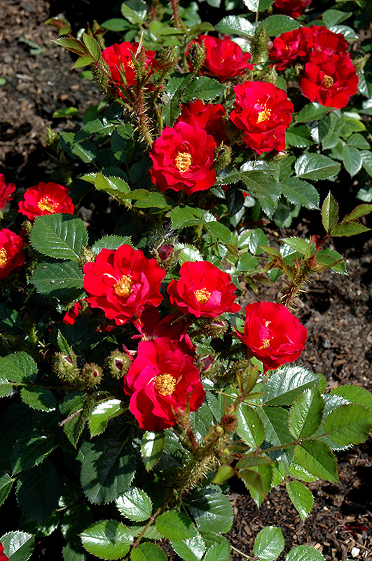 Hardiness Zone: 4b Group/Class: Miniature Rose Description: Volumes of stunning scarlet red double blooms, with golden centers; creates great interest in small spaces, as groundcover and in containers; excellent disease resistance Ornamental Features Scarlet Moss Rose features showy lightly-scented double scarlet flowers with gold eyes at the ends of the branches from late spring to early fall. The flowers are excellent for cutting. It has dark green deciduous foliage. The glossy oval compound leaves do not develop any appreciable fall color. Landscape Attributes Scarlet Moss Rose is a multi-stemmed deciduous shrub with an upright spreading habit of growth. Its average texture blends into the landscape, but can be balanced by one or two finer or coarser trees or shrubs for an effective composition. This shrub will require occasional maintenance and upkeep, and is best pruned in late winter once the threat of extreme cold has passed. It is a good choice for attracting bees to your yard. It has no significant negative characteristics. Scarlet Moss Rose is recommended for the following landscape applications; Planting & Growing Scarlet Moss Rose will grow to be about 18 inches tall at maturity, with a spread of 18 inches. It tends to fill out right to the ground and therefore doesn't necessarily require facer plants in front. It grows at a fast rate, and under ideal conditions can be expected to live for approximately 30 years. This shrub should only be grown in full sunlight. It does best in average to evenly moist conditions, but will not tolerate standing water. It is not particular as to soil type or pH. It is highly tolerant of urban pollution and will even thrive in inner city environments. This particular variety is an interspecific hybrid. Scarlet Moss Rose makes a fine choice for the outdoor landscape, but it is also well-suited for use in outdoor pots and containers. It is often used as a 'filler' in the 'spiller-thriller-filler' container combination, providing a mass of flowers against which the larger thriller plants stand out. Note that when grown in a container, it may not perform exactly as indicated on the tag - this is to be expected. Also note that when growing plants in outdoor containers and baskets, they may require more frequent waterings than they would in the yard or garden.