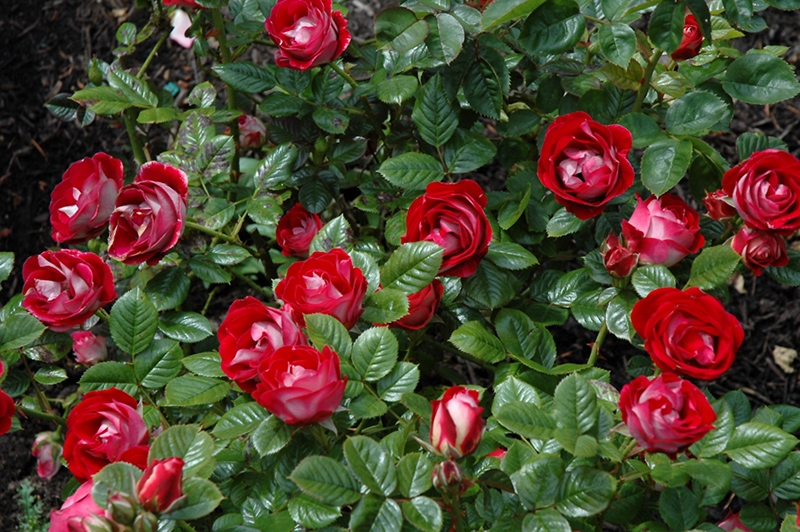 Hardiness Zone: 4a Group/Class: Shrub Rose Description: This beautiful and hardy variety produces striking scarlet red blooms with white centers and reverses; quite impressive as an accent or massed; all roses need full sun and well-drained soil Ornamental Features Teeny Bopper Rose features showy double scarlet flowers with white overtones and a white reverse at the ends of the branches from late spring to early fall. The flowers are excellent for cutting. It has green deciduous foliage. The glossy oval compound leaves do not develop any appreciable fall color. Landscape Attributes Teeny Bopper Rose is a multi-stemmed deciduous shrub with an upright spreading habit of growth. Its average texture blends into the landscape, but can be balanced by one or two finer or coarser trees or shrubs for an effective composition. This shrub will require occasional maintenance and upkeep, and is best pruned in late winter once the threat of extreme cold has passed. Gardeners should be aware of the following characteristic(s) that may warrant special consideration; Teeny Bopper Rose is recommended for the following landscape applications; Planting & Growing Teeny Bopper Rose will grow to be about 18 inches tall at maturity, with a spread of 18 inches. It tends to fill out right to the ground and therefore doesn't necessarily require facer plants in front. It grows at a fast rate, and under ideal conditions can be expected to live for approximately 20 years. This shrub should only be grown in full sunlight. It does best in average to evenly moist conditions, but will not tolerate standing water. It is not particular as to soil type or pH. It is somewhat tolerant of urban pollution. This particular variety is an interspecific hybrid.