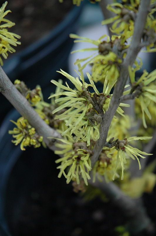 Hardiness Zone: 4b Other Names: Witch Hazel Description: Nothing breaks the monotony of late winter like the highly fragrant witchhazel; this variety features soft yellow strap-like flowers in tight bunches along the branches and a wide-spreading habit of growth Ornamental Features Angelly Witchhazel is covered in stunning fragrant buttery yellow strap-like flowers with red eyes along the branches from late winter to early spring before the leaves. It has green deciduous foliage. The serrated round leaves turn an outstanding yellow in the fall. Landscape Attributes Angelly Witchhazel is a multi-stemmed deciduous shrub with a ground-hugging habit of growth. Its average texture blends into the landscape, but can be balanced by one or two finer or coarser trees or shrubs for an effective composition. This shrub will require occasional maintenance and upkeep, and should only be pruned after flowering to avoid removing any of the current season's flowers. Deer don't particularly care for this plant and will usually leave it alone in favor of tastier treats. Gardeners should be aware of the following characteristic(s) that may warrant special consideration; Angelly Witchhazel is recommended for the following landscape applications; Planting & Growing Angelly Witchhazel will grow to be about 14 feet tall at maturity, with a spread of 14 feet. It has a low canopy with a typical clearance of 2 feet from the ground, and is suitable for planting under power lines. It grows at a medium rate, and under ideal conditions can be expected to live for 40 years or more. This shrub performs well in both full sun and full shade. It is quite adaptable, prefering to grow in average to wet conditions, and will even tolerate some standing water. It is not particular as to soil type, but has a definite preference for acidic soils, and is subject to chlorosis (yellowing) of the foliage in alkaline soils. It is somewhat tolerant of urban pollution. This particular variety is an interspecific hybrid.