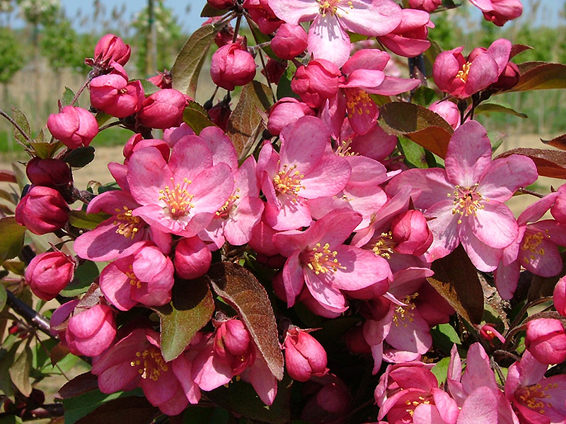 Hardiness Zone: 4a Other Names: Roseybloom, Crabapple Description: A delightful shrub with showy rose pink flowers in spring and deep red fruit in fall, very compact, rounded habit of growth with interesting burgundy green summer foliage; best used as a solitary, needs well-drained soil and full sun Ornamental Features Ivanhoe Flowering Crab is blanketed in stunning clusters of fragrant fuchsia flowers with white overtones along the branches in mid spring before the leaves. The fruits are showy dark red pomes carried in abundance from early to mid fall. It has burgundy-variegated dark green foliage. The pointy leaves turn gold in fall. Landscape Attributes Ivanhoe Flowering Crab is a multi-stemmed deciduous shrub with a more or less rounded form. Its average texture blends into the landscape, but can be balanced by one or two finer or coarser trees or shrubs for an effective composition. This shrub will require occasional maintenance and upkeep, and is best pruned in late winter once the threat of extreme cold has passed. It has no significant negative characteristics. Ivanhoe Flowering Crab is recommended for the following landscape applications; Planting & Growing Ivanhoe Flowering Crab will grow to be about 8 feet tall at maturity, with a spread of 8 feet. It has a low canopy with a typical clearance of 1 foot from the ground, and is suitable for planting under power lines. It grows at a medium rate, and under ideal conditions can be expected to live for 50 years or more. This shrub should only be grown in full sunlight. It prefers to grow in average to moist conditions, and shouldn't be allowed to dry out. It is not particular as to soil type or pH. It is highly tolerant of urban pollution and will even thrive in inner city environments. This particular variety is an interspecific hybrid.