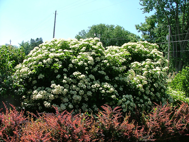 Hardiness Zone: 3a Other Names: Arrowwood Description: A striking garden shrub with showy flat-topped clusters of creamy white flowers in spring followed by masses of bluish-black berries; lustrous leaves turn a burgundy-red fall color, rugged and adaptable, ideal for the garden or as a natural hedge Ornamental Features Cream Puffs Viburnum is covered in stunning creamy white flat-top flowers at the ends of the branches in late spring. The royal blue fruits are held in abundance in spectacular clusters from early to late fall. It has forest green deciduous foliage. The serrated oval leaves turn an outstanding burgundy in the fall. Landscape Attributes Cream Puffs Viburnum is a multi-stemmed deciduous shrub with an upright spreading habit of growth. Its average texture blends into the landscape, but can be balanced by one or two finer or coarser trees or shrubs for an effective composition. This is a relatively low maintenance shrub, and should only be pruned after flowering to avoid removing any of the current season's flowers. It is a good choice for attracting birds to your yard, but is not particularly attractive to deer who tend to leave it alone in favor of tastier treats. It has no significant negative characteristics. Cream Puffs Viburnum is recommended for the following landscape applications; Planting & Growing Cream Puffs Viburnum will grow to be about 10 feet tall at maturity, with a spread of 12 feet. It tends to be a little leggy, with a typical clearance of 2 feet from the ground, and is suitable for planting under power lines. It grows at a medium rate, and under ideal conditions can be expected to live for 40 years or more. This shrub does best in full sun to partial shade. It prefers to grow in average to moist conditions, and shouldn't be allowed to dry out. It is not particular as to soil type or pH. It is highly tolerant of urban pollution and will even thrive in inner city environments. This is a selection of a native North American species.