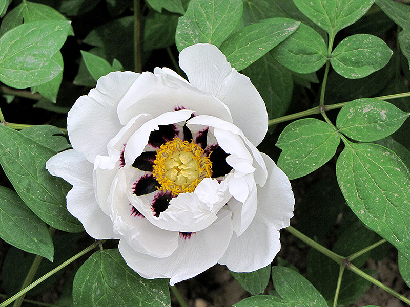 Hardiness Zone: 4b Other Names: Schoolar Holding Pink Tree Peony Description: Lovely white flowers with contrasting burgundy-black flares, around a cluster of golden stamens; great as an accent in the garden or massed in borders; unlike perennial peonies, remember not to prune this variety Ornamental Features Shu Sheng Peng Mo Tree Peony features bold lightly-scented semi-double white cup-shaped flowers with gold eyes and a black blotch at the ends of the branches from mid to late spring. The flowers are excellent for cutting. It has green deciduous foliage. The lobed compound leaves do not develop any appreciable fall color. Landscape Attributes Shu Sheng Peng Mo Tree Peony is a multi-stemmed deciduous shrub with an upright spreading habit of growth. Its relatively fine texture sets it apart from other landscape plants with less refined foliage. This is a relatively low maintenance shrub, and should never be pruned except to remove any dieback, as it tends not to take pruning well. It is a good choice for attracting bees and butterflies to your yard, but is not particularly attractive to deer who tend to leave it alone in favor of tastier treats. It has no significant negative characteristics. Shu Sheng Peng Mo Tree Peony is recommended for the following landscape applications; Planting & Growing Shu Sheng Peng Mo Tree Peony will grow to be about 6 feet tall at maturity, with a spread of 5 feet. It has a low canopy, and is suitable for planting under power lines. It grows at a slow rate, and under ideal conditions can be expected to live for 50 years or more. This shrub does best in full sun to partial shade. It does best in average to evenly moist conditions, but will not tolerate standing water. It is not particular as to soil pH, but grows best in rich soils. It is quite intolerant of urban pollution, therefore inner city or urban streetside plantings are best avoided. Consider applying a thick mulch around the root zone in winter to protect it in exposed locations or colder microclimates. This is a selected variety of a species not originally from North America.