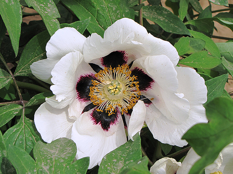 Hardiness Zone: 4b Other Names: Snow In Sunny Spring Tree Peony Description: Beautiful white cupped flowers have dramatic burgundy-black flares and golden stamens; great as an accent in the garden or massed in borders; unlike perennial peonies, remember not to prune this variety Ornamental Features Yang Chun Bai Xue Tree Peony features bold lightly-scented semi-double white cup-shaped flowers with gold eyes and a black blotch at the ends of the branches from mid to late spring. The flowers are excellent for cutting. It has green deciduous foliage. The compound leaves do not develop any appreciable fall color. Landscape Attributes Yang Chun Bai Xue Tree Peony is a multi-stemmed deciduous shrub with an upright spreading habit of growth. Its relatively fine texture sets it apart from other landscape plants with less refined foliage. This is a relatively low maintenance shrub, and should never be pruned except to remove any dieback, as it tends not to take pruning well. It is a good choice for attracting bees and butterflies to your yard, but is not particularly attractive to deer who tend to leave it alone in favor of tastier treats. It has no significant negative characteristics. Yang Chun Bai Xue Tree Peony is recommended for the following landscape applications; Planting & Growing Yang Chun Bai Xue Tree Peony will grow to be about 5 feet tall at maturity, with a spread of 5 feet. It has a low canopy, and is suitable for planting under power lines. It grows at a slow rate, and under ideal conditions can be expected to live for 50 years or more. This shrub does best in full sun to partial shade. It does best in average to evenly moist conditions, but will not tolerate standing water. It is not particular as to soil pH, but grows best in rich soils. It is quite intolerant of urban pollution, therefore inner city or urban streetside plantings are best avoided. Consider applying a thick mulch around the root zone in winter to protect it in exposed locations or colder microclimates. This is a selected variety of a species not originally from North America.