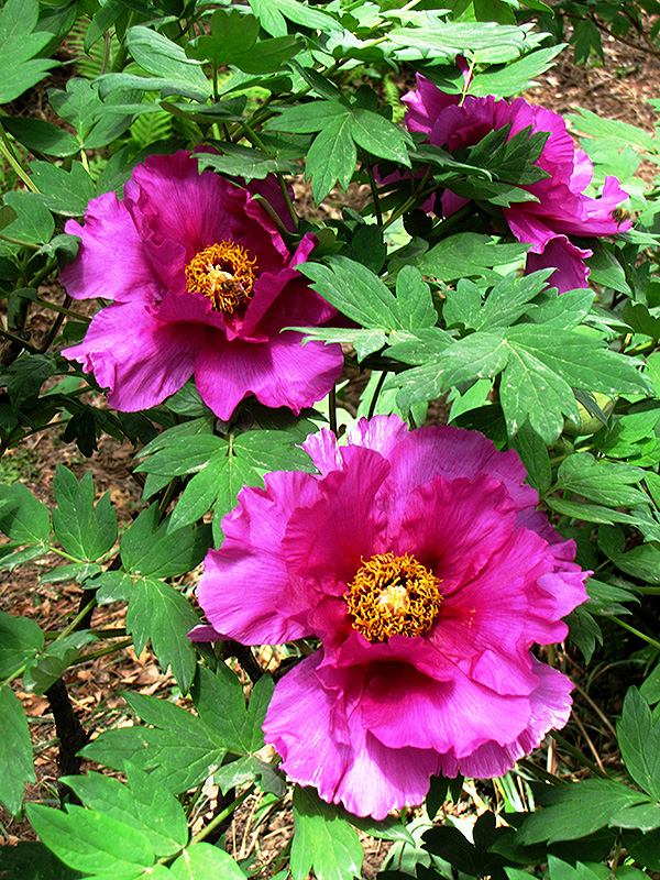 Hardiness Zone: 4b Description: A beautiful woody peony for the garden, presenting lavender-pink blooms with ruffled petals and golden stamens; great as an accent in the garden or massed in borders; unlike perennial peonies, remember not to prune this variety Ornamental Features Brocaded Gown Tree Peony features bold lightly-scented semi-double purple cup-shaped flowers with pink overtones and gold eyes at the ends of the branches from mid to late spring. The flowers are excellent for cutting. It has green deciduous foliage. The narrow compound leaves do not develop any appreciable fall color. Landscape Attributes Brocaded Gown Tree Peony is a multi-stemmed deciduous shrub with an upright spreading habit of growth. Its relatively fine texture sets it apart from other landscape plants with less refined foliage. This is a relatively low maintenance shrub, and should not require much pruning, except when necessary, such as to remove dieback. It is a good choice for attracting bees and butterflies to your yard, but is not particularly attractive to deer who tend to leave it alone in favor of tastier treats. It has no significant negative characteristics. Brocaded Gown Tree Peony is recommended for the following landscape applications; Planting & Growing Brocaded Gown Tree Peony will grow to be about 6 feet tall at maturity, with a spread of 6 feet. It has a low canopy, and is suitable for planting under power lines. It grows at a slow rate, and under ideal conditions can be expected to live for 50 years or more. This shrub does best in full sun to partial shade. It does best in average to evenly moist conditions, but will not tolerate standing water. It is not particular as to soil pH, but grows best in rich soils. It is quite intolerant of urban pollution, therefore inner city or urban streetside plantings are best avoided. Consider applying a thick mulch around the root zone in winter to protect it in exposed locations or colder microclimates. This is a selected variety of a species not originally from North America.