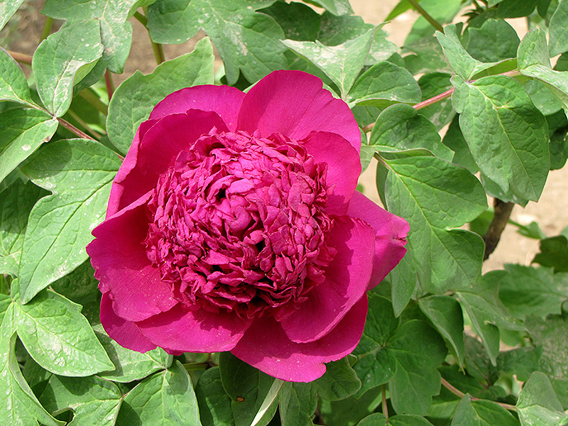 Hardiness Zone: 4b Other Names: Garnet-Red Light on Desk Tree Peony Description: A beautiful woody peony for the garden, presenting intense hot pink, fully double blooms; great as an accent in the garden or massed in borders; unlike perennial peonies, remember not to prune this variety Ornamental Features Shou An Hong Tree Peony features bold lightly-scented fully double hot pink ball-shaped flowers with yellow eyes at the ends of the branches from mid to late spring. The flowers are excellent for cutting. It has attractive light green deciduous foliage. The narrow compound leaves are highly ornamental but do not develop any appreciable fall color. Landscape Attributes Shou An Hong Tree Peony is a multi-stemmed deciduous shrub with an upright spreading habit of growth. Its relatively fine texture sets it apart from other landscape plants with less refined foliage. This is a relatively low maintenance shrub, and should not require much pruning, except when necessary, such as to remove dieback. It is a good choice for attracting bees and butterflies to your yard, but is not particularly attractive to deer who tend to leave it alone in favor of tastier treats. It has no significant negative characteristics. Shou An Hong Tree Peony is recommended for the following landscape applications; Planting & Growing Shou An Hong Tree Peony will grow to be about 6 feet tall at maturity, with a spread of 6 feet. It has a low canopy, and is suitable for planting under power lines. It grows at a slow rate, and under ideal conditions can be expected to live for 50 years or more. This shrub does best in full sun to partial shade. It does best in average to evenly moist conditions, but will not tolerate standing water. It is not particular as to soil pH, but grows best in rich soils. It is quite intolerant of urban pollution, therefore inner city or urban streetside plantings are best avoided. Consider applying a thick mulch around the root zone in winter to protect it in exposed locations or colder microclimates. This is a selected variety of a species not originally from North America.