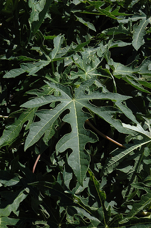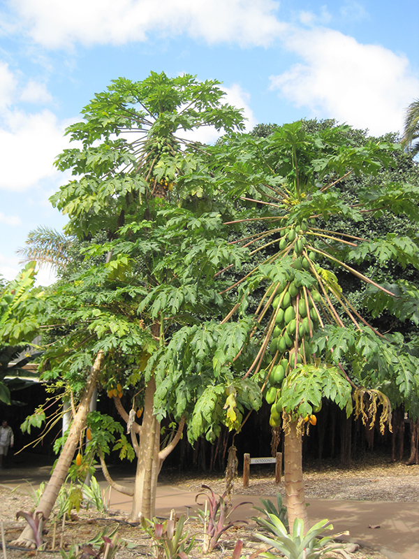 Hardiness Zone: 9b Description: A small succulent, broadleaf evergreen tree that may bear papaya fruits throughout the year; its non-woody trunk bears scars of old leaf bases, topped with an umbrella-like canopy of large palmately lobed leaves; excellent for containers Edible Qualities Papaya is a small tree that is typically grown for its edible qualities. It produces gold oblong fruit (technically 'pomes') with a yellow blush and pink flesh which are typically harvested when mature. The fruits have a sweet taste. The fruit are most often used in the following ways: Features & Attributes Papaya has attractive dark green evergreen foliage on a tree with an upright spreading habit of growth. The lobed palmate leaves are highly ornamental and remain dark green throughout the winter. The fruits are showy gold pomes with a yellow blush, which are carried in abundance in late fall. The fruit can be messy if allowed to drop on the lawn or walkways, and may require occasional clean-up. The gray branches add an interesting dimension to the landscape. This is an evergreen tree with a strong central leader and an upright spreading habit of growth. Its relatively coarse texture can be used to stand it apart from other landscape plants with finer foliage. This plant will require occasional maintenance and upkeep, and should not require much pruning, except when necessary, such as to remove dieback. It is a good choice for attracting birds, bees and butterflies to your yard. It has no significant negative characteristics. Aside from its primary use as an edible, Papaya is sutiable for the following landscape applications; Planting & Growing Papaya will grow to be about 20 feet tall at maturity, with a spread of 10 feet. It has a low canopy with a typical clearance of 3 feet from the ground, and is suitable for planting under power lines. It grows at a fast rate, and under ideal conditions can be expected to live for approximately 10 years. This plant is typically grown in a designated edibles garden. It should only be grown in full sunlight. It prefers to grow in average to moist conditions, and shouldn't be allowed to dry out. It is not particular as to soil type or pH. It is somewhat tolerant of urban pollution. This species is not originally from North America. Papaya is a good choice for the edible garden, but it is also well-suited for use in outdoor pots and containers. Its large size and upright habit of growth lend it for use as a solitary accent, or in a composition surrounded by smaller plants around the base and those that spill over the edges. It is even sizeable enough that it can be grown alone in a suitable container. Note that when grown in a container, it may not perform exactly as indicated on the tag - this is to be expected. Also note that when growing plants in outdoor containers and baskets, they may require more frequent waterings than they would in the yard or garden.