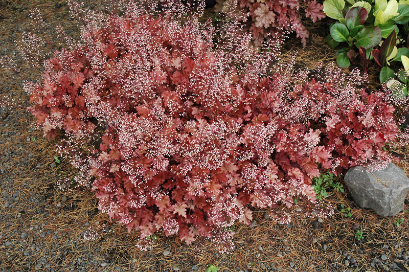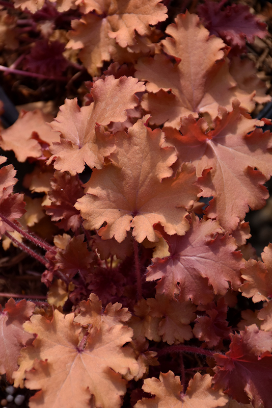 Hardiness Zone: 4a Other Names: Coralbells, Alumroot Description: Heavily ruffled foliage develops stunning hues of orange, peach, gold, and scarlet red; spikes of ivory bells in late spring to early summer; amazing contrast to other plants; great versatility; keep soil moist in heat of summer Ornamental Features Peach Crisp Coral Bells features dainty spikes of creamy white bell-shaped flowers rising above the foliage from late spring to early summer. Its attractive crinkled lobed leaves emerge orange in spring, turning peach in color with showy scarlet variegation and tinges of gold the rest of the year. Landscape Attributes Peach Crisp Coral Bells is a dense herbaceous evergreen perennial with tall flower stalks held atop a low mound of foliage. Its relatively fine texture sets it apart from other garden plants with less refined foliage. This is a relatively low maintenance plant, and should be cut back in late fall in preparation for winter. It is a good choice for attracting hummingbirds to your yard. It has no significant negative characteristics. Peach Crisp Coral Bells is recommended for the following landscape applications; Planting & Growing Peach Crisp Coral Bells will grow to be about 14 inches tall at maturity extending to 20 inches tall with the flowers, with a spread of 18 inches. When grown in masses or used as a bedding plant, individual plants should be spaced approximately 15 inches apart. Its foliage tends to remain dense right to the ground, not requiring facer plants in front. It grows at a medium rate, and under ideal conditions can be expected to live for approximately 10 years. As an evegreen perennial, this plant will typically keep its form and foliage year-round. This plant performs well in both full sun and full shade. However, you may want to keep it away from hot, dry locations that receive direct afternoon sun or which get reflected sunlight, such as against the south side of a white wall. It prefers to grow in average to moist conditions, and shouldn't be allowed to dry out. It is not particular as to soil type or pH. It is somewhat tolerant of urban pollution. Consider applying a thick mulch around the root zone in winter to protect it in exposed locations or colder microclimates. This particular variety is an interspecific hybrid. It can be propagated by division; however, as a cultivated variety, be aware that it may be subject to certain restrictions or prohibitions on propagation. Peach Crisp Coral Bells is a fine choice for the garden, but it is also a good selection for planting in outdoor pots and containers. With its upright habit of growth, it is best suited for use as a 'thriller' in the 'spiller-thriller-filler' container combination; plant it near the center of the pot, surrounded by smaller plants and those that spill over the edges. Note that when growing plants in outdoor containers and baskets, they may require more frequent waterings than they would in the yard or garden.