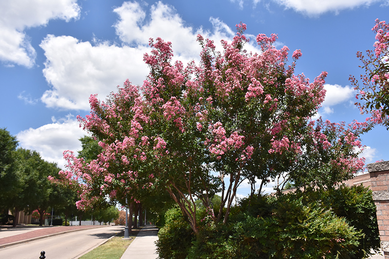 Hardiness Zone: 6b Other Names: Crape Myrtle, Crepe Myrtle Description: This stunning ornamental shrub or small tree produces volumes of deep pink blooms with white edged petals in summer, followed by orange-red fall foliage; captivating focal point for the garden or border; also good for container planting Ornamental Features Peppermint Lace Crapemyrtle is blanketed in stunning panicles of hot pink frilly flowers with white edges at the ends of the branches from early to late summer. It has attractive dark green deciduous foliage which emerges coppery-bronze in spring. The oval leaves are highly ornamental and turn orange in fall. Landscape Attributes Peppermint Lace Crapemyrtle is a dense multi-stemmed deciduous shrub with a mounded form. Its relatively fine texture sets it apart from other landscape plants with less refined foliage. This is a relatively low maintenance shrub, and is best pruned in late winter once the threat of extreme cold has passed. It has no significant negative characteristics. Peppermint Lace Crapemyrtle is recommended for the following landscape applications; Planting & Growing Peppermint Lace Crapemyrtle will grow to be about 15 feet tall at maturity, with a spread of 15 feet. It tends to be a little leggy, with a typical clearance of 2 feet from the ground, and is suitable for planting under power lines. It grows at a fast rate, and under ideal conditions can be expected to live for approximately 20 years. This shrub does best in full sun to partial shade. It prefers to grow in average to moist conditions, and shouldn't be allowed to dry out. It is very fussy about its soil conditions and must have rich, acidic soils to ensure success, and is subject to chlorosis (yellowing) of the foliage in alkaline soils. It is highly tolerant of urban pollution and will even thrive in inner city environments. This is a selected variety of a species not originally from North America. Peppermint Lace Crapemyrtle makes a fine choice for the outdoor landscape, but it is also well-suited for use in outdoor pots and containers. Because of its height, it is often used as a 'thriller' in the 'spiller-thriller-filler' container combination; plant it near the center of the pot, surrounded by smaller plants and those that spill over the edges. It is even sizeable enough that it can be grown alone in a suitable container. Note that when grown in a container, it may not perform exactly as indicated on the tag - this is to be expected. Also note that when growing plants in outdoor containers and baskets, they may require more frequent waterings than they would in the yard or garden.