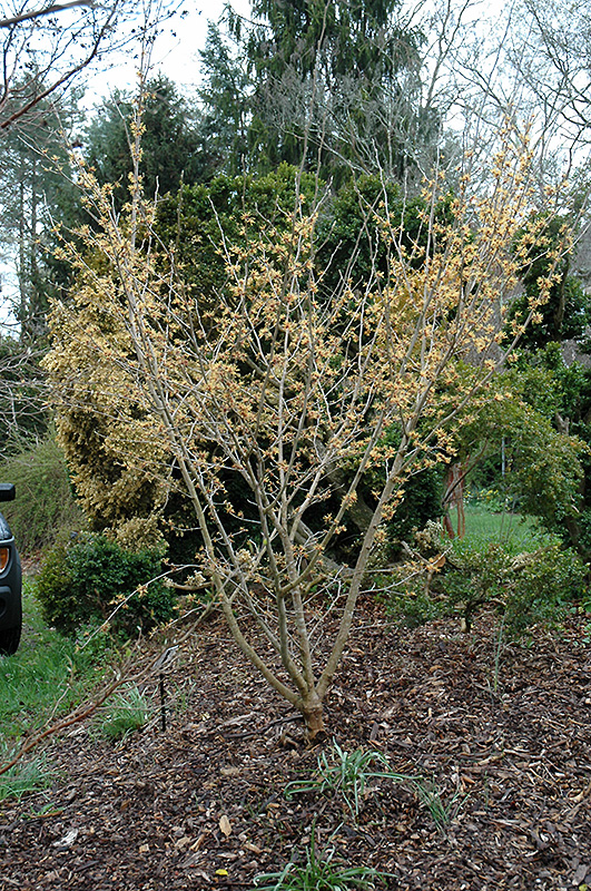 Hardiness Zone: 4b Other Names: Witch Hazel Description: When it comes to heralding the end of winter, it doesn't get much better than this fine shrub, with its softly fragrant richly orange-gold strap-like flowers held along the branches on an upright form, spectacular fall color as well Ornamental Features Orange Encore Witchhazel is covered in stunning fragrant orange strap-like flowers with red calyces along the branches from late winter to early spring before the leaves. It has green deciduous foliage. The serrated round leaves turn an outstanding yellow in the fall. Landscape Attributes Orange Encore Witchhazel is a multi-stemmed deciduous shrub with a more or less rounded form. Its average texture blends into the landscape, but can be balanced by one or two finer or coarser trees or shrubs for an effective composition. This shrub will require occasional maintenance and upkeep, and should only be pruned after flowering to avoid removing any of the current season's flowers. Deer don't particularly care for this plant and will usually leave it alone in favor of tastier treats. Gardeners should be aware of the following characteristic(s) that may warrant special consideration; Orange Encore Witchhazel is recommended for the following landscape applications; Planting & Growing Orange Encore Witchhazel will grow to be about 12 feet tall at maturity, with a spread of 15 feet. It has a low canopy with a typical clearance of 2 feet from the ground, and is suitable for planting under power lines. It grows at a medium rate, and under ideal conditions can be expected to live for 40 years or more. This shrub performs well in both full sun and full shade. It is quite adaptable, prefering to grow in average to wet conditions, and will even tolerate some standing water. It is not particular as to soil type, but has a definite preference for acidic soils, and is subject to chlorosis (yellowing) of the foliage in alkaline soils. It is somewhat tolerant of urban pollution. This particular variety is an interspecific hybrid.