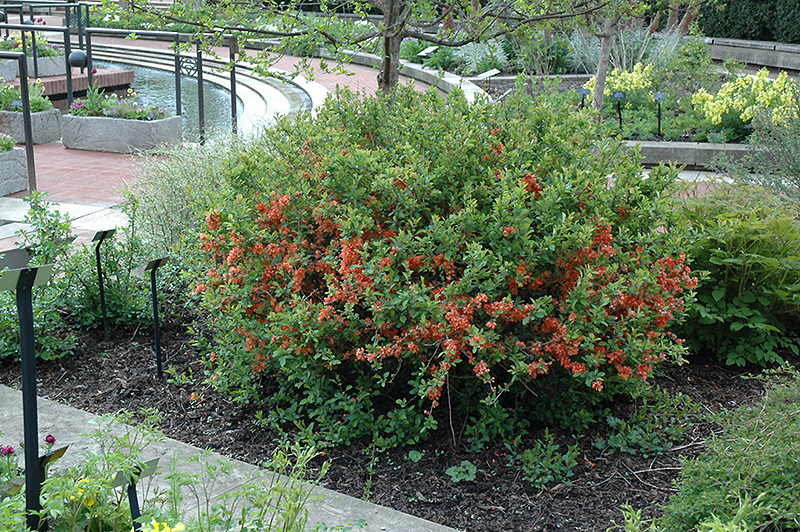 Hardiness Zone: 5a Description: Quite the paradox in the landscape; hot scarlet to fiery red flowers cover the branches in spring, but after that recedes to the barkground with limited ornamental qualities; best used in the garden or as a low barrier, needs frequent pruning Ornamental Features Japanese Flowering Quince has scarlet cup-shaped flowers along the branches in early spring before the leaves. It has dark green deciduous foliage. The glossy oval leaves do not develop any appreciable fall color. The fruits are showy yellow pomes displayed in mid fall. The fruit can be messy if allowed to drop on the lawn or walkways, and may require occasional clean-up. This plant is primarily grown as an ornamental, but it's also valued for its edible qualities. The bitter fruit is most often used in the following ways: Landscape Attributes Japanese Flowering Quince is a multi-stemmed deciduous shrub with a ground-hugging habit of growth. Its relatively coarse texture can be used to stand it apart from other landscape plants with finer foliage. This is a high maintenance shrub that will require regular care and upkeep, and should only be pruned after flowering to avoid removing any of the current season's flowers. Gardeners should be aware of the following characteristic(s) that may warrant special consideration; Japanese Flowering Quince is recommended for the following landscape applications; Planting & Growing Japanese Flowering Quince will grow to be about 3 feet tall at maturity, with a spread of 4 feet. It tends to fill out right to the ground and therefore doesn't necessarily require facer plants in front. It grows at a medium rate, and under ideal conditions can be expected to live for 40 years or more. This shrub should only be grown in full sunlight. It is very adaptable to both dry and moist locations, and should do just fine under typical garden conditions. It is not particular as to soil type or pH. It is highly tolerant of urban pollution and will even thrive in inner city environments. This species is not originally from North America.
