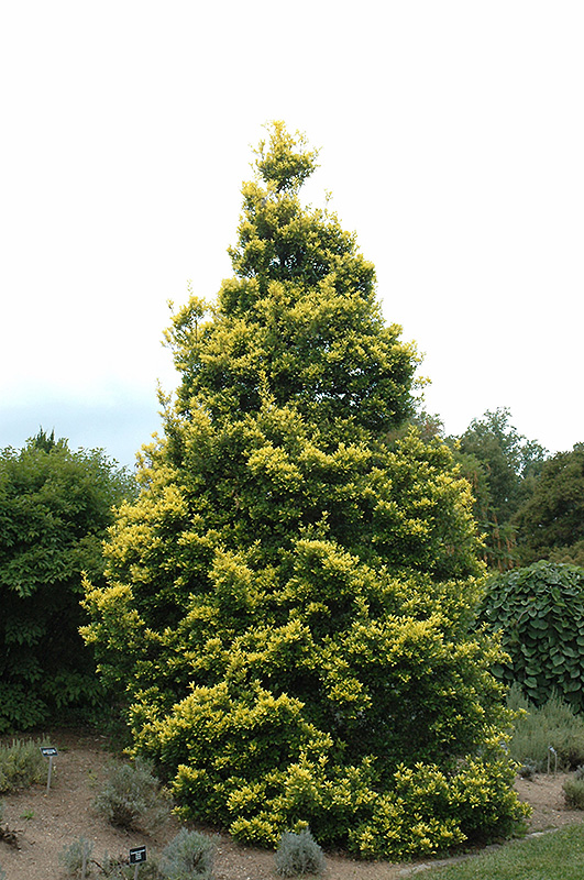 Hardiness Zone: 6b Description: This hybrid is a pyrimidal broadleaf evergreen tree-holly with bright yellow-gold and dark green variegated foliage; yellow coloring intensifies in full sun, and may be absent in full shade; an abundance of showy red berries in winter; needs pollinator Ornamental Features Sunny Foster Holly is primarily grown for its highly ornamental fruit. It features an abundance of magnificent red berries from mid fall to late winter. It has gold-variegated dark green foliage which emerges yellow in spring. The spiny pointy leaves remain dark green throughout the winter. Landscape Attributes Sunny Foster Holly is a dense evergreen tree with a strong central leader and a distinctive and refined pyramidal form. Its average texture blends into the landscape, but can be balanced by one or two finer or coarser trees or shrubs for an effective composition. This is a relatively low maintenance tree, and is best pruned in late winter once the threat of extreme cold has passed. It is a good choice for attracting birds to your yard. It has no significant negative characteristics. Sunny Foster Holly is recommended for the following landscape applications; Planting & Growing Sunny Foster Holly will grow to be about 30 feet tall at maturity, with a spread of 20 feet. It has a low canopy with a typical clearance of 2 feet from the ground, and should not be planted underneath power lines. It grows at a slow rate, and under ideal conditions can be expected to live for 40 years or more. This is a female variety of the species which requires a male selection of the same species growing nearby in order to set fruit. This tree does best in full sun to partial shade. It requires an evenly moist well-drained soil for optimal growth, but will die in standing water. It is very fussy about its soil conditions and must have rich, acidic soils to ensure success, and is subject to chlorosis (yellowing) of the foliage in alkaline soils. It is somewhat tolerant of urban pollution. Consider applying a thick mulch around the root zone in winter to protect it in exposed locations or colder microclimates. This particular variety is an interspecific hybrid.