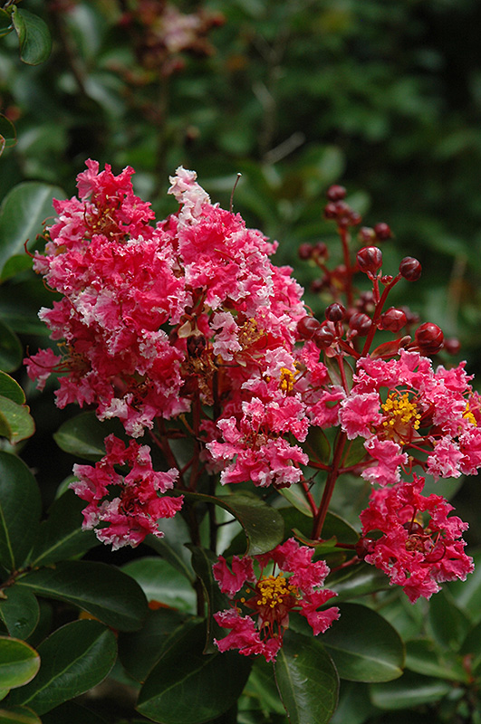 Hardiness Zone: 6b Other Names: Crape Myrtle, Crepe Myrtle Description: This stunning ornamental shrub or small tree produces volumes of frilly hot pink blooms with white outer margins, followed by red-orange fall foliage; captivating focal point for the garden or border; also good for container planting Ornamental Features Prairie Lace Crapemyrtle is covered in stunning panicles of pink frilly flowers with white edges at the ends of the branches from early to late summer. It has attractive dark green deciduous foliage which emerges dark red in spring. The oval leaves are highly ornamental and turn red in fall. Landscape Attributes Prairie Lace Crapemyrtle is a dense multi-stemmed deciduous shrub with an upright spreading habit of growth. Its relatively fine texture sets it apart from other landscape plants with less refined foliage. This is a relatively low maintenance shrub, and is best pruned in late winter once the threat of extreme cold has passed. It has no significant negative characteristics. Prairie Lace Crapemyrtle is recommended for the following landscape applications; Planting & Growing Prairie Lace Crapemyrtle will grow to be about 10 feet tall at maturity, with a spread of 10 feet. It tends to be a little leggy, with a typical clearance of 2 feet from the ground, and is suitable for planting under power lines. It grows at a fast rate, and under ideal conditions can be expected to live for approximately 20 years. This shrub does best in full sun to partial shade. It prefers to grow in average to moist conditions, and shouldn't be allowed to dry out. It is very fussy about its soil conditions and must have rich, acidic soils to ensure success, and is subject to chlorosis (yellowing) of the foliage in alkaline soils. It is highly tolerant of urban pollution and will even thrive in inner city environments. This is a selected variety of a species not originally from North America. Prairie Lace Crapemyrtle makes a fine choice for the outdoor landscape, but it is also well-suited for use in outdoor pots and containers. Its large size and upright habit of growth lend it for use as a solitary accent, or in a composition surrounded by smaller plants around the base and those that spill over the edges. It is even sizeable enough that it can be grown alone in a suitable container. Note that when grown in a container, it may not perform exactly as indicated on the tag - this is to be expected. Also note that when growing plants in outdoor containers and baskets, they may require more frequent waterings than they would in the yard or garden.