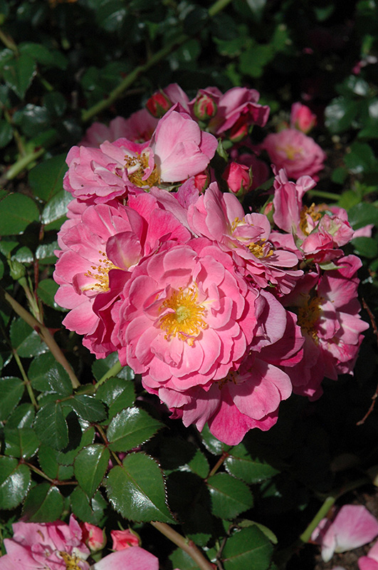 Hardiness Zone: 4a Group/Class: Shrub Rose Description: The clusters of vivid, magenta-pink ruffled blooms are produced continuously on a low mounded shrub with glossy green healthy foliage; these fragrant blooms make great cut flowers; excellent for mass planting or borders Ornamental Features Magic Meidiland Rose features showy clusters of fragrant double hot pink flowers with gold eyes at the ends of the branches from late spring to mid fall. The flowers are excellent for cutting. It has dark green foliage edged in dark red. The glossy oval compound leaves do not develop any appreciable fall color. Landscape Attributes Magic Meidiland Rose is a multi-stemmed deciduous shrub with a mounded form. Its average texture blends into the landscape, but can be balanced by one or two finer or coarser trees or shrubs for an effective composition. This shrub will require occasional maintenance and upkeep, and is best pruned in late winter once the threat of extreme cold has passed. It is a good choice for attracting bees to your yard. Gardeners should be aware of the following characteristic(s) that may warrant special consideration; Magic Meidiland Rose is recommended for the following landscape applications; Planting & Growing Magic Meidiland Rose will grow to be about 3 feet tall at maturity, with a spread of 3 feet. It tends to fill out right to the ground and therefore doesn't necessarily require facer plants in front. It grows at a medium rate, and under ideal conditions can be expected to live for approximately 20 years. This shrub should only be grown in full sunlight. It does best in average to evenly moist conditions, but will not tolerate standing water. It is not particular as to soil type or pH. It is somewhat tolerant of urban pollution. This particular variety is an interspecific hybrid.