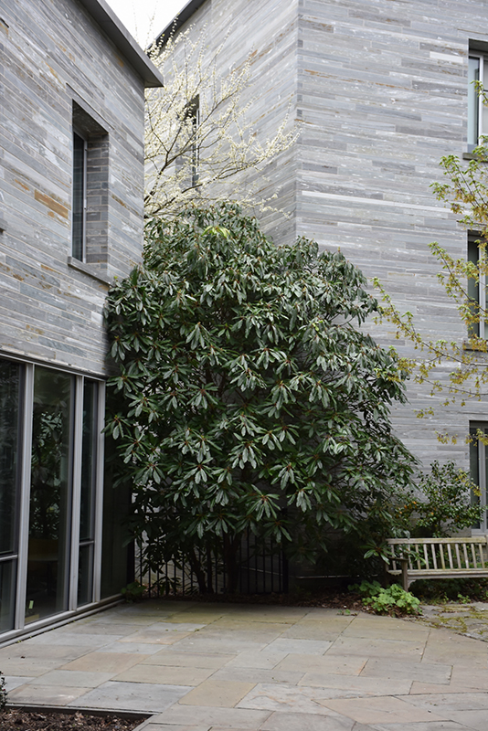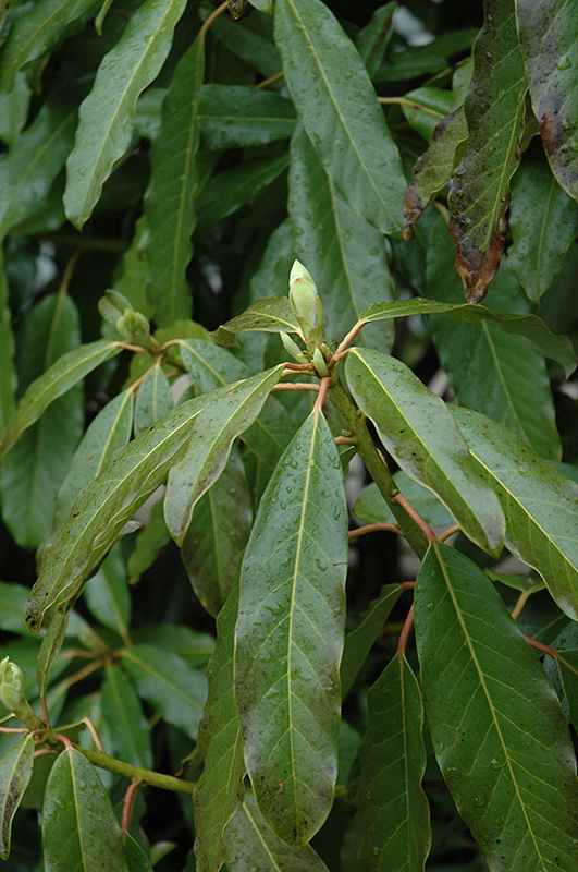 Hardiness Zone: 6a Description: This variety closely resembles a rhododendron, but flowers are inconspicuous; long, broad, glossy leaves with bright pink petioles hang down from the branches, creating a lovely green display; dark blue berries in late winter Ornamental Features Daphniphyllum has attractive dark green foliage with pointy chartreuse spines on a tree with a round habit of growth. The large glossy narrow leaves are highly ornamental and remain dark green throughout the winter. The fruits are showy steel blue drupes displayed in late winter. Landscape Attributes Daphniphyllum is a multi-stemmed evergreen tree with a more or less rounded form. Its average texture blends into the landscape, but can be balanced by one or two finer or coarser trees or shrubs for an effective composition. This is a relatively low maintenance tree, and should only be pruned after flowering to avoid removing any of the current season's flowers. Deer don't particularly care for this plant and will usually leave it alone in favor of tastier treats. It has no significant negative characteristics. Daphniphyllum is recommended for the following landscape applications; Planting & Growing Daphniphyllum will grow to be about 20 feet tall at maturity, with a spread of 20 feet. It has a low canopy with a typical clearance of 2 feet from the ground, and is suitable for planting under power lines. It grows at a slow rate, and under ideal conditions can be expected to live for approximately 30 years. This tree performs well in both full sun and full shade. It does best in average to evenly moist conditions, but will not tolerate standing water. It is not particular as to soil pH, but grows best in rich soils. It is somewhat tolerant of urban pollution, and will benefit from being planted in a relatively sheltered location. Consider applying a thick mulch around the root zone in winter to protect it in exposed locations or colder microclimates. This species is not originally from North America. Daphniphyllum is a fine choice for the yard, but it is also a good selection for planting in outdoor pots and containers. Because of its height, it is often used as a 'thriller' in the 'spiller-thriller-filler' container combination; plant it near the center of the pot, surrounded by smaller plants and those that spill over the edges. It is even sizeable enough that it can be grown alone in a suitable container. Note that when grown in a container, it may not perform exactly as indicated on the tag - this is to be expected. Also note that when growing plants in outdoor containers and baskets, they may require more frequent waterings than they would in the yard or garden.