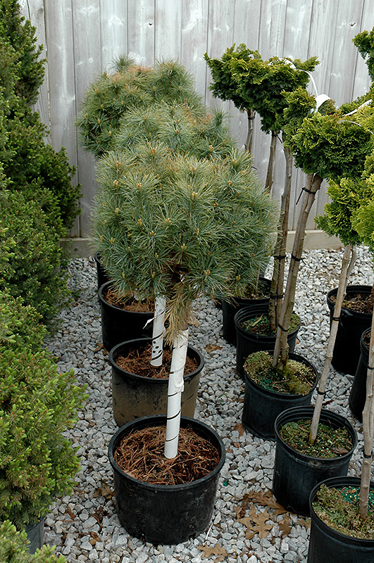Hardiness Zone: 3a Other Names: Eastern White Pine Description: A spectacular small tree form of this variety with luminous silver blue foliage; extremely compact and slow growing, excellent for form, texture and color detail in home gardens or rock gardens; tends to show more blue than other cultivars Ornamental Features Sea Urchin White Pine (tree form) is primarily valued in the landscape or garden for its highly ornamental lollipop-like shape. It has attractive silvery blue evergreen foliage. The needles are highly ornamental and remain silvery blue throughout the winter. Landscape Attributes Sea Urchin White Pine (tree form) is a dense evergreen dwarf tree, selected and trained to grow in a small tree-like form with the primary plant grafted high atop a standard. Its relatively fine texture sets it apart from other landscape plants with less refined foliage. This dwarf tree will require occasional maintenance and upkeep. When pruning is necessary, it is recommended to only trim back the new growth of the current season, other than to remove any dieback. Gardeners should be aware of the following characteristic(s) that may warrant special consideration; Sea Urchin White Pine (tree form) is ideal for use as a garden accent or patio feature, and is recommended for the following landscape applications; Planting & Growing Sea Urchin White Pine (tree form) will grow to be about 4 feet tall at maturity, with a spread of 24 inches. It tends to be a little leggy, with a typical clearance of 2 feet from the ground. It grows at a slow rate, and under ideal conditions can be expected to live for 50 years or more. This dwarf tree should only be grown in full sunlight. It is very adaptable to both dry and moist growing conditions, but will not tolerate any standing water. It is not particular as to soil type, but has a definite preference for acidic soils, and is subject to chlorosis (yellowing) of the foliage in alkaline soils. It is quite intolerant of urban pollution, therefore inner city or urban streetside plantings are best avoided, and will benefit from being planted in a relatively sheltered location. This is a selection of a native North American species.