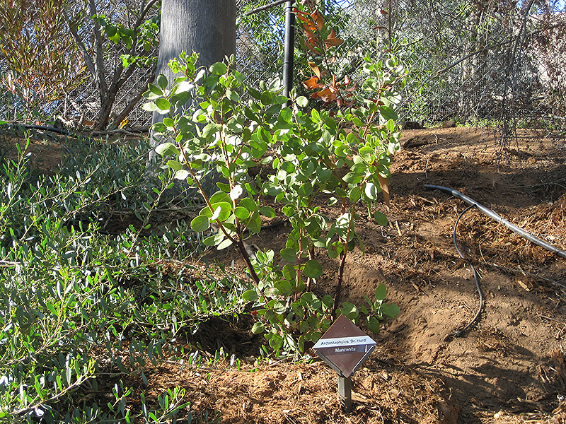 Hardiness Zone: 7a Description: A densely leafed large shrub or small tree; dainty white flowers in winter followed by red berries; tolerates alkaline soils; drought tolerant once established; sculptural branches make it a great accent plant Ornamental Features Dr. Hurd Manzanita features dainty nodding white bell-shaped flowers at the ends of the branches from late winter to mid spring. It has forest green evergreen foliage. The oval leaves remain forest green throughout the winter. Landscape Attributes Dr. Hurd Manzanita is a dense multi-stemmed evergreen shrub with an upright spreading habit of growth. Its average texture blends into the landscape, but can be balanced by one or two finer or coarser trees or shrubs for an effective composition. This shrub will require occasional maintenance and upkeep, and should only be pruned after flowering to avoid removing any of the current season's flowers. It is a good choice for attracting birds, bees and butterflies to your yard, but is not particularly attractive to deer who tend to leave it alone in favor of tastier treats. It has no significant negative characteristics. Dr. Hurd Manzanita is recommended for the following landscape applications; Planting & Growing Dr. Hurd Manzanita will grow to be about 15 feet tall at maturity, with a spread of 15 feet. It tends to fill out right to the ground and therefore doesn't necessarily require facer plants in front, and is suitable for planting under power lines. It grows at a slow rate, and under ideal conditions can be expected to live for approximately 30 years. This shrub does best in full sun to partial shade. It is very adaptable to both dry and moist growing conditions, but will not tolerate any standing water. It is considered to be drought-tolerant, and thus makes an ideal choice for xeriscaping or the moisture-conserving landscape. It is not particular as to soil pH, but grows best in sandy soils. It is somewhat tolerant of urban pollution. This is a selection of a native North American species. Dr. Hurd Manzanita makes a fine choice for the outdoor landscape, but it is also well-suited for use in outdoor pots and containers. Its large size and upright habit of growth lend it for use as a solitary accent, or in a composition surrounded by smaller plants around the base and those that spill over the edges. It is even sizeable enough that it can be grown alone in a suitable container. Note that when grown in a container, it may not perform exactly as indicated on the tag - this is to be expected. Also note that when growing plants in outdoor containers and baskets, they may require more frequent waterings than they would in the yard or garden.