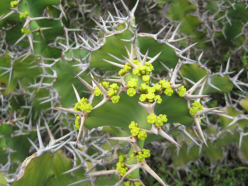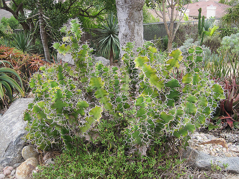 Hardiness Zone: 9a Description: An extremely thorny, decorative variety with spines in the shape of cow horns; narrow green foliage atop cactus-like branches that store moisture; showy yellow flowers followed by purple fruits; adds a truly exotic dimension to the garden Ornamental Features Cow's Horn features showy clusters of yellow flowers at the ends of the branches from mid spring to early summer. It has attractive dark green evergreen foliage. The glossy narrow leaves are highly ornamental and remain dark green throughout the winter. It features abundant showy purple capsules in late summer. Landscape Attributes Cow's Horn is an open multi-stemmed evergreen shrub with an upright spreading habit of growth. Its relatively coarse texture can be used to stand it apart from other landscape plants with finer foliage. This is a relatively low maintenance shrub, and should not require much pruning, except when necessary, such as to remove dieback. Deer don't particularly care for this plant and will usually leave it alone in favor of tastier treats. Gardeners should be aware of the following characteristic(s) that may warrant special consideration; Cow's Horn is recommended for the following landscape applications; Planting & Growing Cow's Horn will grow to be about 12 feet tall at maturity, with a spread of 12 feet. It has a low canopy, and is suitable for planting under power lines. It grows at a slow rate, and under ideal conditions can be expected to live for 60 years or more. This shrub does best in full sun to partial shade. It prefers dry to average moisture levels with very well-drained soil, and will often die in standing water. It is considered to be drought-tolerant, and thus makes an ideal choice for xeriscaping or the moisture-conserving landscape. It is not particular as to soil pH, but grows best in sandy soils. It is highly tolerant of urban pollution and will even thrive in inner city environments. This species is not originally from North America, and parts of it are known to be toxic to humans and animals, so care should be exercised in planting it around children and pets. Cow's Horn makes a fine choice for the outdoor landscape, but it is also well-suited for use in outdoor pots and containers. Its large size and upright habit of growth lend it for use as a solitary accent, or in a composition surrounded by smaller plants around the base and those that spill over the edges. It is even sizeable enough that it can be grown alone in a suitable container. Note that when grown in a container, it may not perform exactly as indicated on the tag - this is to be expected. Also note that when growing plants in outdoor containers and baskets, they may require more frequent waterings than they would in the yard or garden.