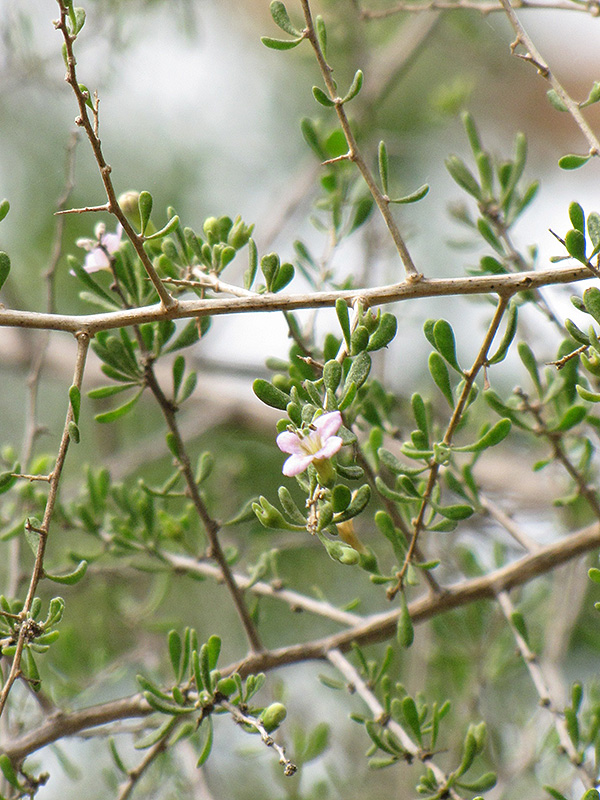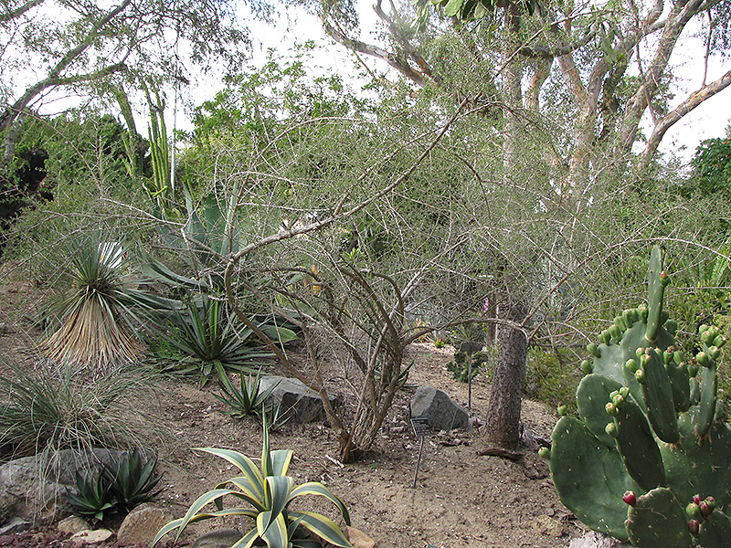 Hardiness Zone: 8b Other Names: Common Desert Thorn, Wolfberry Description: An upright, spreading shrub grown primarily for its abundant, showy berries that are attractive to birds; long, flexible canes with clusters of tiny gray-green leaves; lavender white flowers appear in late spring are rather subtle Ornamental Features Baja Desert-thorn is primarily grown for its highly ornamental fruit. It features an abundance of magnificent red berries from late summer to mid fall. The fruit can be messy if allowed to drop on the lawn or walkways, and may require occasional clean-up. It is draped in stunning lavender trumpet-shaped flowers with white overtones along the branches from late spring to early summer. It has grayish green deciduous foliage. The tiny fuzzy oval leaves do not develop any appreciable fall color. Landscape Attributes Baja Desert-thorn is a multi-stemmed deciduous shrub with an upright spreading habit of growth. Its relatively fine texture sets it apart from other landscape plants with less refined foliage. This shrub will require occasional maintenance and upkeep, and is best pruned in late winter once the threat of extreme cold has passed. It is a good choice for attracting birds to your yard, but is not particularly attractive to deer who tend to leave it alone in favor of tastier treats. Gardeners should be aware of the following characteristic(s) that may warrant special consideration; Baja Desert-thorn is recommended for the following landscape applications; Planting & Growing Baja Desert-thorn will grow to be about 12 feet tall at maturity, with a spread of 12 feet. It has a low canopy, and is suitable for planting under power lines. It grows at a medium rate, and under ideal conditions can be expected to live for 40 years or more. This shrub does best in full sun to partial shade. It is very adaptable to both dry and moist growing conditions, but will not tolerate any standing water. It is considered to be drought-tolerant, and thus makes an ideal choice for xeriscaping or the moisture-conserving landscape. It is not particular as to soil type or pH. It is highly tolerant of urban pollution and will even thrive in inner city environments. This species is native to parts of North America. Baja Desert-thorn makes a fine choice for the outdoor landscape, but it is also well-suited for use in outdoor pots and containers. Its large size and upright habit of growth lend it for use as a solitary accent, or in a composition surrounded by smaller plants around the base and those that spill over the edges. It is even sizeable enough that it can be grown alone in a suitable container. Note that when grown in a container, it may not perform exactly as indicated on the tag - this is to be expected. Also note that when growing plants in outdoor containers and baskets, they may require more frequent waterings than they would in the yard or garden.