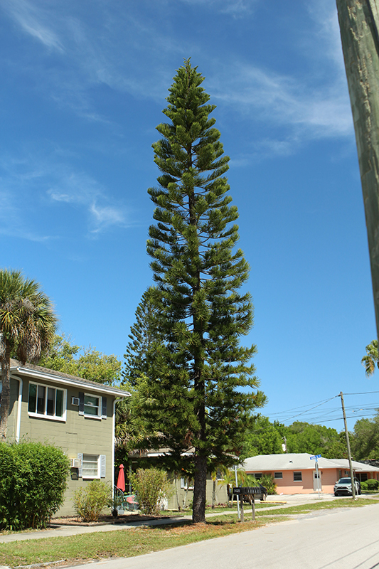Hardiness Zone: 9b Other Names: New Caledonia Pine, Columnar Araucaria Description: A very fine ornamental tree that is columnar in habit with a curving trunk at the base, and peeling bark; foliage is soft to touch and finely delicate; an incredible accent tree that is tolerant of most soils; great in containers; does not tolerate frost Ornamental Features Cook Pine is primarily valued in the landscape for its rigidly columnar form. It has attractive green evergreen foliage. The tiny pointy leaves are highly ornamental and remain green throughout the winter. Landscape Attributes Cook Pine is an open evergreen tree with a strong central leader and a narrowly upright and columnar growth habit. It lends an extremely fine and delicate texture to the landscape composition which can make it a great accent feature on this basis alone. This is a relatively low maintenance tree, and usually looks its best without pruning, although it will tolerate pruning. Deer don't particularly care for this plant and will usually leave it alone in favor of tastier treats. It has no significant negative characteristics. Cook Pine is recommended for the following landscape applications; Planting & Growing Cook Pine will grow to be about 60 feet tall at maturity, with a spread of 18 feet. It has a low canopy with a typical clearance of 3 feet from the ground, and should not be planted underneath power lines. It grows at a slow rate, and under ideal conditions can be expected to live to a ripe old age of 200 years or more; think of this as a heritage tree for future generations! This tree should only be grown in full sunlight. It does best in average to evenly moist conditions, but will not tolerate standing water. It is not particular as to soil type or pH, and is able to handle environmental salt. It is quite intolerant of urban pollution, therefore inner city or urban streetside plantings are best avoided. Consider applying a thick mulch around the root zone in winter to protect it in exposed locations or colder microclimates. This species is not originally from North America. Cook Pine is a fine choice for the yard, but it is also a good selection for planting in outdoor pots and containers. Its large size and upright habit of growth lend it for use as a solitary accent, or in a composition surrounded by smaller plants around the base and those that spill over the edges. It is even sizeable enough that it can be grown alone in a suitable container. Note that when grown in a container, it may not perform exactly as indicated on the tag - this is to be expected. Also note that when growing plants in outdoor containers and baskets, they may require more frequent waterings than they would in the yard or garden.