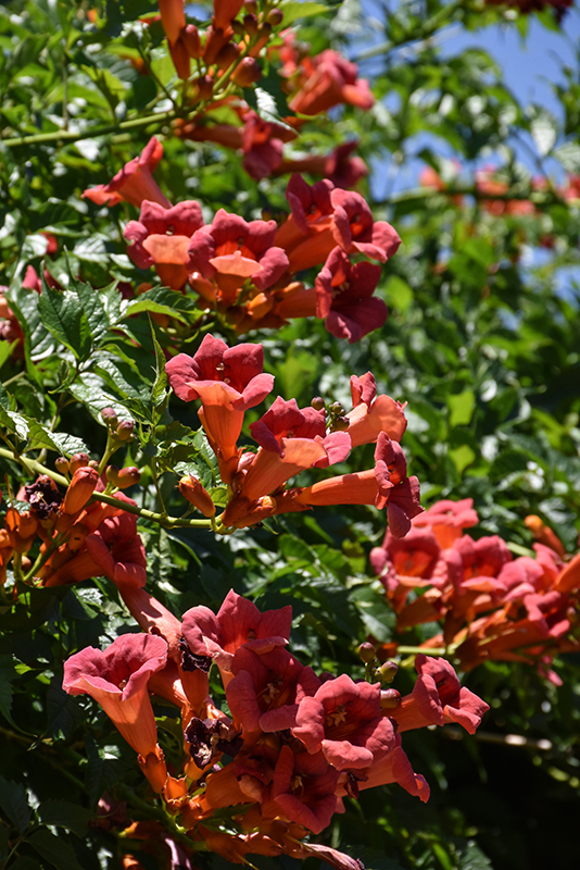 Hardiness Zone: 4b Other Names: Trumpetcreeper Group/Class: Summer Jazz Series Description: This smaller variety is compact and tame; clusters of luxurious red-orange blooms are visually stunning; excellent for containers and small trellises; grows very quickly and covers by self clinging Ornamental Features Summer Jazz™ Fire Trumpetvine features bold clusters of red trumpet-shaped flowers with orange overtones at the ends of the branches from late spring to early fall. It has dark green deciduous foliage. The serrated pointy pinnately compound leaves turn yellow in fall. Landscape Attributes Summer Jazz™ Fire Trumpetvine is a dense multi-stemmed deciduous woody vine with a twining and trailing habit of growth. Its average texture blends into the landscape, but can be balanced by one or two finer or coarser trees or shrubs for an effective composition. This woody vine will require occasional maintenance and upkeep, and can be pruned at anytime. It is a good choice for attracting birds and hummingbirds to your yard, but is not particularly attractive to deer who tend to leave it alone in favor of tastier treats. Gardeners should be aware of the following characteristic(s) that may warrant special consideration; Summer Jazz™ Fire Trumpetvine is recommended for the following landscape applications; Planting & Growing Summer Jazz™ Fire Trumpetvine will grow to be about 6 feet tall at maturity, with a spread of 24 inches. As a climbing vine, it tends to be leggy near the base and should be underplanted with low-growing facer plants. It should be planted near a fence, trellis or other landscape structure where it can be trained to grow upwards on it, or allowed to trail off a retaining wall or slope. It grows at a fast rate, and under ideal conditions can be expected to live for approximately 20 years. This woody vine does best in full sun to partial shade. It is very adaptable to both dry and moist locations, and should do just fine under average home landscape conditions. It is considered to be drought-tolerant, and thus makes an ideal choice for xeriscaping or the moisture-conserving landscape. It is not particular as to soil type or pH, and is able to handle environmental salt. It is highly tolerant of urban pollution and will even thrive in inner city environments. This is a selection of a native North American species.