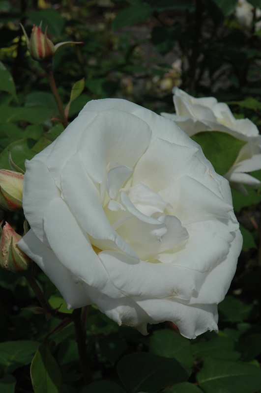 Hardiness Zone: 5b Group/Class: Grandiflora Rose Description: This lovely variety produces gorgeous, large white blooms with pale yellow centers; lightly fragrant; perfect for cutting; a stunning presentation with excellent disease resistance Ornamental Features Mount Shasta Rose features showy lightly-scented double white flowers with gold eyes and buttery yellow centers at the ends of the branches from late spring to mid fall. The flowers are excellent for cutting. It has green deciduous foliage. The glossy oval compound leaves do not develop any appreciable fall color. Landscape Attributes Mount Shasta Rose is a multi-stemmed deciduous shrub with an upright spreading habit of growth. Its average texture blends into the landscape, but can be balanced by one or two finer or coarser trees or shrubs for an effective composition. This shrub will require occasional maintenance and upkeep, and is best pruned in late winter once the threat of extreme cold has passed. It is a good choice for attracting bees to your yard. It has no significant negative characteristics. Mount Shasta Rose is recommended for the following landscape applications; Planting & Growing Mount Shasta Rose will grow to be about 4 feet tall at maturity, with a spread of 3 feet. It tends to fill out right to the ground and therefore doesn't necessarily require facer plants in front. It grows at a fast rate, and under ideal conditions can be expected to live for approximately 30 years. This shrub should only be grown in full sunlight. It does best in average to evenly moist conditions, but will not tolerate standing water. It is not particular as to soil type or pH. It is highly tolerant of urban pollution and will even thrive in inner city environments. This particular variety is an interspecific hybrid.