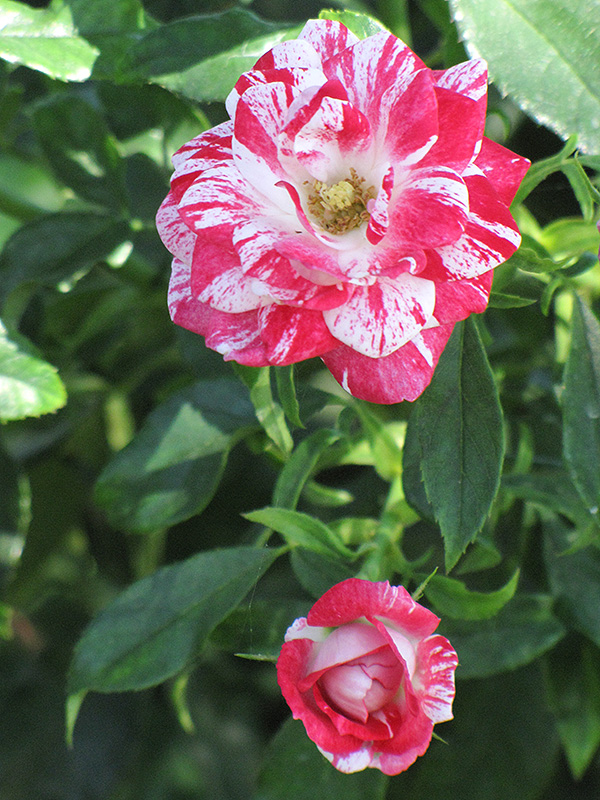 Hardiness Zone: 4a Group/Class: Shrub Rose Description: A shrub variety producing clusters of stunning tri-color blooms of white and pink, with red spots and streaks; mild apple scent; flowers in flushes all season; compact habit is great for low shrub borders and small garden spaces Ornamental Features Rockin' Robin Rose features showy lightly-scented white flowers with shell pink overtones, gold eyes and scarlet streaks at the ends of the branches from late spring to early fall. The flowers are excellent for cutting. It has green deciduous foliage. The glossy oval compound leaves do not develop any appreciable fall color. Landscape Attributes Rockin' Robin Rose is a multi-stemmed deciduous shrub with an upright spreading habit of growth. Its average texture blends into the landscape, but can be balanced by one or two finer or coarser trees or shrubs for an effective composition. This is a high maintenance shrub that will require regular care and upkeep, and is best pruned in late winter once the threat of extreme cold has passed. Gardeners should be aware of the following characteristic(s) that may warrant special consideration; Rockin' Robin Rose is recommended for the following landscape applications; Planting & Growing Rockin' Robin Rose will grow to be about 3 feet tall at maturity, with a spread of 30 inches. It tends to fill out right to the ground and therefore doesn't necessarily require facer plants in front. It grows at a fast rate, and under ideal conditions can be expected to live for approximately 20 years. This shrub should only be grown in full sunlight. It does best in average to evenly moist conditions, but will not tolerate standing water. It is not particular as to soil type or pH. It is somewhat tolerant of urban pollution. This particular variety is an interspecific hybrid. Rockin' Robin Rose makes a fine choice for the outdoor landscape, but it is also well-suited for use in outdoor pots and containers. With its upright habit of growth, it is best suited for use as a 'thriller' in the 'spiller-thriller-filler' container combination; plant it near the center of the pot, surrounded by smaller plants and those that spill over the edges. It is even sizeable enough that it can be grown alone in a suitable container. Note that when grown in a container, it may not perform exactly as indicated on the tag - this is to be expected. Also note that when growing plants in outdoor containers and baskets, they may require more frequent waterings than they would in the yard or garden.