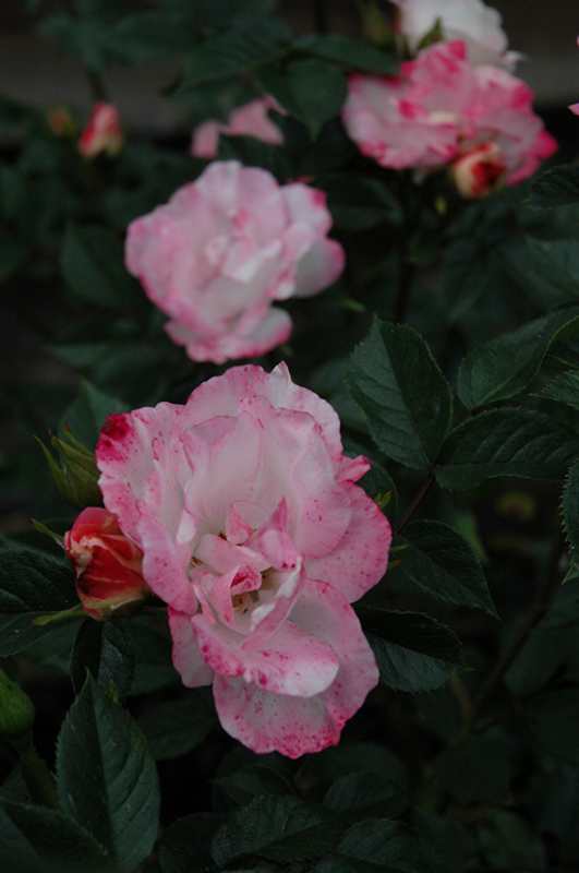 Hardiness Zone: 6a Group/Class: Miniature Rose Description: A bushy miniature that produces striking clusters of pink and white blooms that are spotted and streaked in red; creates great interest in small spaces, as groundcover, or in containers; excellent disease resistance; mild fragrance Ornamental Features Whistle Stop Rose features showy clusters of lightly-scented semi-double pink flowers with white overtones, gold eyes and red spots at the ends of the branches from late spring to early fall. The flowers are excellent for cutting. It has dark green deciduous foliage. The glossy oval compound leaves do not develop any appreciable fall color. Landscape Attributes Whistle Stop Rose is a multi-stemmed deciduous shrub with an upright spreading habit of growth. Its average texture blends into the landscape, but can be balanced by one or two finer or coarser trees or shrubs for an effective composition. This shrub will require occasional maintenance and upkeep, and is best pruned in late winter once the threat of extreme cold has passed. It is a good choice for attracting bees to your yard. It has no significant negative characteristics. Whistle Stop Rose is recommended for the following landscape applications; Planting & Growing Whistle Stop Rose will grow to be about 16 inches tall at maturity, with a spread of 16 inches. It tends to fill out right to the ground and therefore doesn't necessarily require facer plants in front. It grows at a fast rate, and under ideal conditions can be expected to live for approximately 30 years. This shrub should only be grown in full sunlight. It does best in average to evenly moist conditions, but will not tolerate standing water. It is not particular as to soil type or pH. It is highly tolerant of urban pollution and will even thrive in inner city environments. This particular variety is an interspecific hybrid. Whistle Stop Rose makes a fine choice for the outdoor landscape, but it is also well-suited for use in outdoor pots and containers. It is often used as a 'filler' in the 'spiller-thriller-filler' container combination, providing a mass of flowers against which the larger thriller plants stand out. Note that when grown in a container, it may not perform exactly as indicated on the tag - this is to be expected. Also note that when growing plants in outdoor containers and baskets, they may require more frequent waterings than they would in the yard or garden.