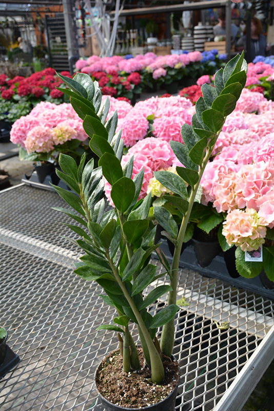 Other Names: Eternity Plant Description: A popular foliage plant that has proved itself to be durable for indoor spaces, handling low light, drought, and abuse; attractive, glossy green oval leaves arranged in pairs along the stems; perfect for office environments Features & Attributes ZZ Plant's attractive oval pinnately compound leaves emerge light green, turning dark green in color throughout the year on a plant with an upright spreading habit of growth. This is an herbaceous evergreen houseplant with an upright spreading habit of growth. This plant can be pruned at any time to keep it looking its best. Planting & Growing When grown indoors, ZZ Plant can be expected to grow to be about 3 feet tall at maturity, with a spread of 3 feet. It grows at a slow rate, and under ideal conditions can be expected to live for approximately 30 years. This houseplant performs well in both bright or indirect sunlight and strong artificial light, and can therefore be situated in almost any well-lit room or location. It prefers dry to average moisture levels with very well-drained soil, and may die if left in standing water for any length of time. This plant should be watered when the surface of the soil gets dry, and will need watering approximately once each week. Be aware that your particular watering schedule may vary depending on its location in the room, the pot size, plant size and other conditions; if in doubt, ask one of our experts in the store for advice. It will benefit from a regular feeding with a general-purpose fertilizer with every second or third watering. It is not particular as to soil type or pH; an average potting soil should work just fine. Be warned that parts of this plant are known to be toxic to humans and animals, so special care should be exercised if growing it around children and pets. There are many factors that will affect the ultimate height, spread and overall performance of a plant when grown indoors; among them, the size of the pot it's growing in, the amount of light it receives, watering frequency, the pruning regimen and repotting schedule. Use the information described here as a guideline only; individual performance can and will vary. Please contact the store to speak with one of our experts if you are interested in further details concerning recommendations on pot size, watering, pruning, repotting, etc. -- THIS IS A HOUSEPLANT AND IS NOT MEANT TO SURVIVE THE WINTER OUTDOORS IN OUR CLIMATE --