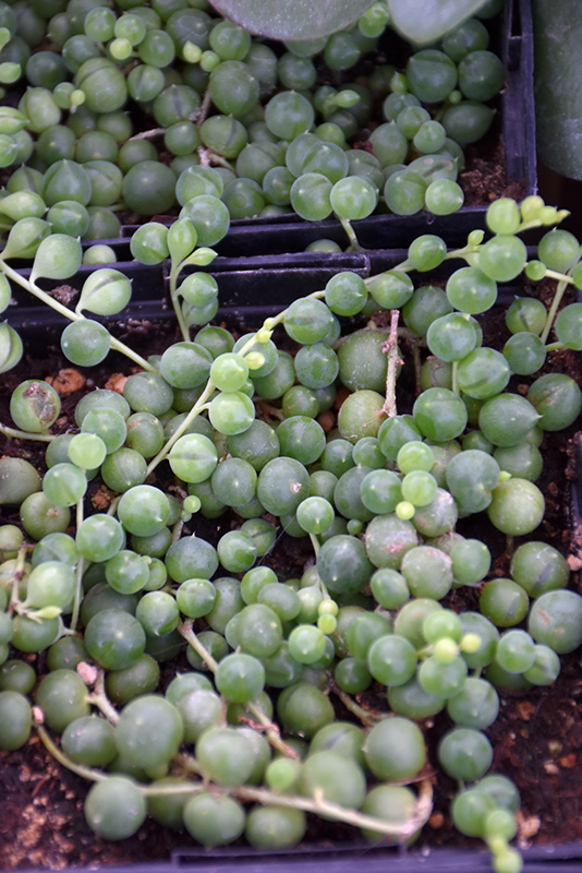 Other Names: String Of Beads Description: An interesting and unusual trailing succulent with spherical green foliage strung along the branches; a dramatic accent spilling over the edges of containers and hanging baskets Features & Attributes String Of Pearls' attractive succulent round leaves remain green in color throughout the year on a plant with a trailing habit of growth. This is an herbaceous evergreen houseplant with a trailing habit of growth, eventually spilling over the edges of hanging baskets and containers. Its extremely fine and delicate texture is quite ornamental and should be used to full effect. This plant usually looks its best without pruning, although it will tolerate pruning. Planting & Growing When grown indoors, String Of Pearls can be expected to grow to be only 2 inches tall at maturity, with a spread of 3 feet. It grows at a medium rate, and under ideal conditions can be expected to live for approximately 10 years. This houseplant will do well in a location that gets either direct or indirect sunlight, although it will usually require a more brightly-lit environment than what artificial indoor lighting alone can provide. It prefers dry to average moisture levels with very well-drained soil, and may die if left in standing water for any length of time. This plant should be watered when the surface of the soil gets dry, and will need watering approximately once each week. Be aware that your particular watering schedule may vary depending on its location in the room, the pot size, plant size and other conditions; if in doubt, ask one of our experts in the store for advice. It is not particular as to soil type or pH; an average potting soil should work just fine. There are many factors that will affect the ultimate height, spread and overall performance of a plant when grown indoors; among them, the size of the pot it's growing in, the amount of light it receives, watering frequency, the pruning regimen and repotting schedule. Use the information described here as a guideline only; individual performance can and will vary. Please contact the store to speak with one of our experts if you are interested in further details concerning recommendations on pot size, watering, pruning, repotting, etc. -- THIS IS A HOUSEPLANT AND IS NOT MEANT TO SURVIVE THE WINTER OUTDOORS IN OUR CLIMATE --