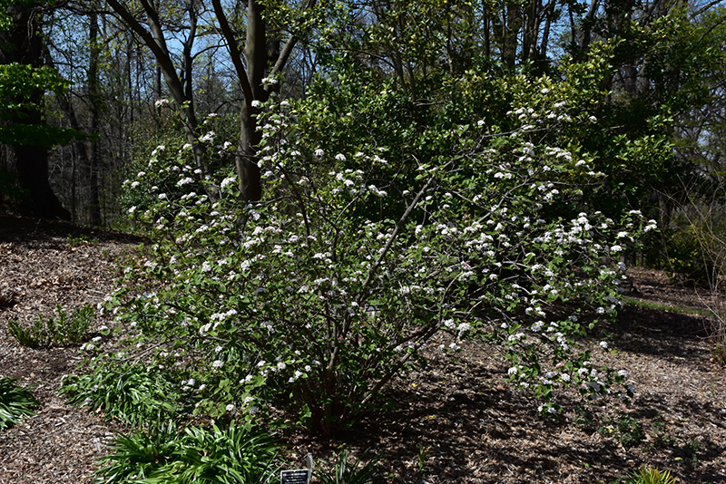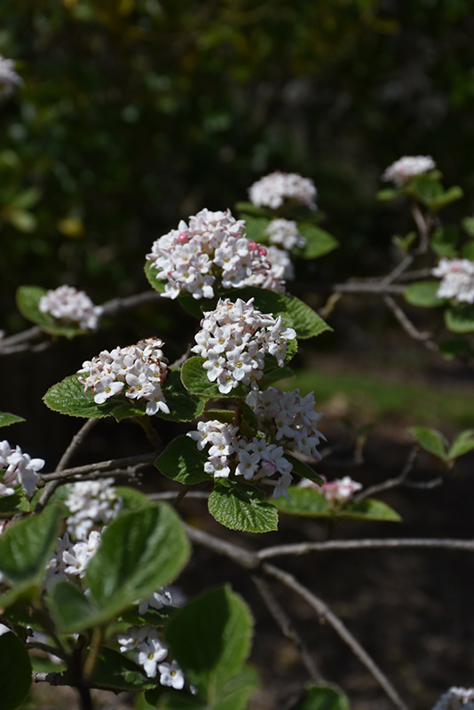 Hardiness Zone: 5a Description: A beautiful, open shrub, covered in intoxicatingly sweet-smelling ball-shaped clusters of pinkish-white flowers in early spring, plant where the fragrance can be enjoyed, tidy the rest of the year; makes a beautiful accent specimen Ornamental Features Bitchiu Viburnum is smothered in stunning balls of fragrant white flowers with shell pink overtones at the ends of the branches in mid spring, which emerge from distinctive rose flower buds. It has dark green deciduous foliage. The heart-shaped leaves turn an outstanding burgundy in the fall. The black fruits are held in clusters from late summer to late fall. Landscape Attributes Bitchiu Viburnum is a dense multi-stemmed deciduous shrub with an upright spreading habit of growth. Its average texture blends into the landscape, but can be balanced by one or two finer or coarser trees or shrubs for an effective composition. This is a relatively low maintenance shrub, and should only be pruned after flowering to avoid removing any of the current season's flowers. It is a good choice for attracting birds to your yard, but is not particularly attractive to deer who tend to leave it alone in favor of tastier treats. It has no significant negative characteristics. Bitchiu Viburnum is recommended for the following landscape applications; Planting & Growing Bitchiu Viburnum will grow to be about 10 feet tall at maturity, with a spread of 10 feet. It tends to be a little leggy, with a typical clearance of 1 foot from the ground, and is suitable for planting under power lines. It grows at a slow rate, and under ideal conditions can be expected to live for 40 years or more. This shrub does best in full sun to partial shade. It prefers to grow in average to moist conditions, and shouldn't be allowed to dry out. It is not particular as to soil type, but has a definite preference for acidic soils. It is somewhat tolerant of urban pollution. This species is not originally from North America.