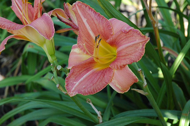 Hardiness Zone: 2b Description: Soft pink and peach colored trumpeted flowers with lemon yellow throats rise above low growing mounds of arching green foliage; blooms early to mid season; low maintenance, excellent for borders, beds and containers; drought tolerant once established Ornamental Features Chicago Peach Daylily features bold pink trumpet-shaped flowers with peach overtones and lemon yellow throats at the ends of the stems from early to mid summer. The flowers are excellent for cutting. Its grassy leaves remain green in color throughout the season. Landscape Attributes Chicago Peach Daylily is an herbaceous perennial with tall flower stalks held atop a low mound of foliage. Its relatively fine texture sets it apart from other garden plants with less refined foliage. This is a relatively low maintenance plant, and is best cleaned up in early spring before it resumes active growth for the season. It is a good choice for attracting butterflies to your yard. It has no significant negative characteristics. Chicago Peach Daylily is recommended for the following landscape applications; Planting & Growing Chicago Peach Daylily will grow to be about 24 inches tall at maturity extending to 32 inches tall with the flowers, with a spread of 24 inches. When grown in masses or used as a bedding plant, individual plants should be spaced approximately 18 inches apart. It grows at a medium rate, and under ideal conditions can be expected to live for approximately 10 years. As an herbaceous perennial, this plant will usually die back to the crown each winter, and will regrow from the base each spring. Be careful not to disturb the crown in late winter when it may not be readily seen! This plant does best in full sun to partial shade. It is very adaptable to both dry and moist locations, and should do just fine under typical garden conditions. It is not particular as to soil type or pH. It is highly tolerant of urban pollution and will even thrive in inner city environments. This particular variety is an interspecific hybrid. It can be propagated by division; however, as a cultivated variety, be aware that it may be subject to certain restrictions or prohibitions on propagation.