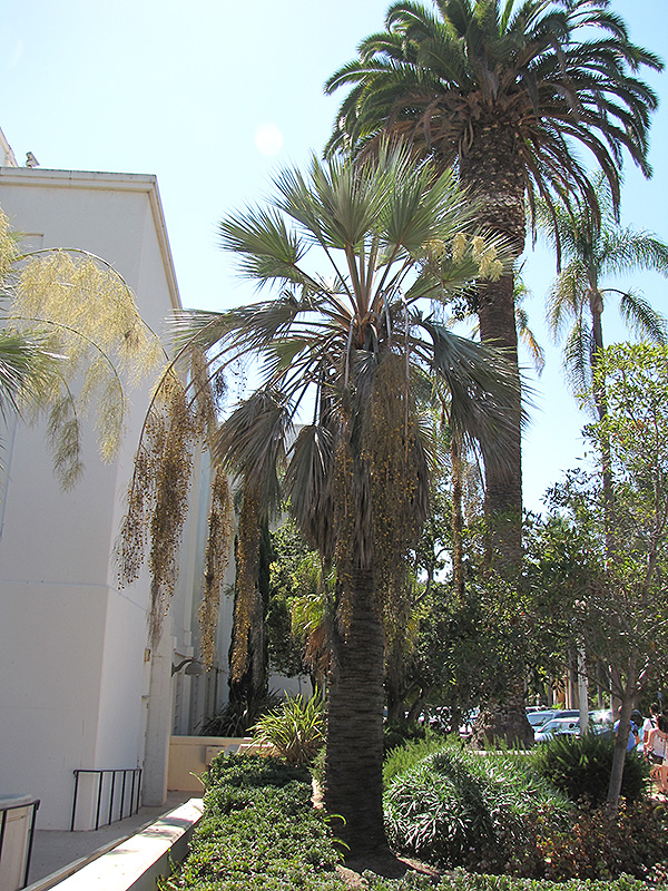 Hardiness Zone: 8b Other Names: Blue Hesper Palm, Blue Fan Palm Description: A majestic palm that is native to Baja California, Mexico; attractive appearance especially when young; persistent leaves should be trimmed away; it can survive mild freezing temps; a wonderful addition to the tropical landscape Ornamental Features Mexican Blue Palm is draped in stunning clusters of chartreuse flowers with yellow overtones hanging below the branches from late winter to early spring. It has attractive grayish green foliage with hints of powder blue. The large fan-shaped palmate leaves are highly ornamental and remain grayish green throughout the winter. The gold fruits are held in abundance in spectacular clusters from early to mid summer. The fruit can be messy if allowed to drop on the lawn or walkways, and may require occasional clean-up. The rough dark brown bark is extremely showy and adds significant winter interest. Landscape Attributes Mexican Blue Palm is an open evergreen tree with a strong central leader and a towering form, with a high canopy of foliage concentrated at the top of the plant. Its average texture blends into the landscape, but can be balanced by one or two finer or coarser trees or shrubs for an effective composition. This is a relatively low maintenance tree, and usually looks its best without pruning, although it will tolerate pruning. It has no significant negative characteristics. Mexican Blue Palm is recommended for the following landscape applications; Planting & Growing Mexican Blue Palm will grow to be about 50 feet tall at maturity, with a spread of 20 feet. It has a high canopy with a typical clearance of 6 feet from the ground, and should not be planted underneath power lines. As it matures, the lower branches of this tree can be strategically removed to create a high enough canopy to support unobstructed human traffic underneath. It grows at a slow rate, and under ideal conditions can be expected to live to a ripe old age of 150 years or more; think of this as a heritage tree for future generations! This tree should only be grown in full sunlight. It does best in average to evenly moist conditions, but will not tolerate standing water. It is very fussy about its soil conditions and must have rich, acidic soils to ensure success, and is subject to chlorosis (yellowing) of the foliage in alkaline soils. It is somewhat tolerant of urban pollution. This species is not originally from North America.