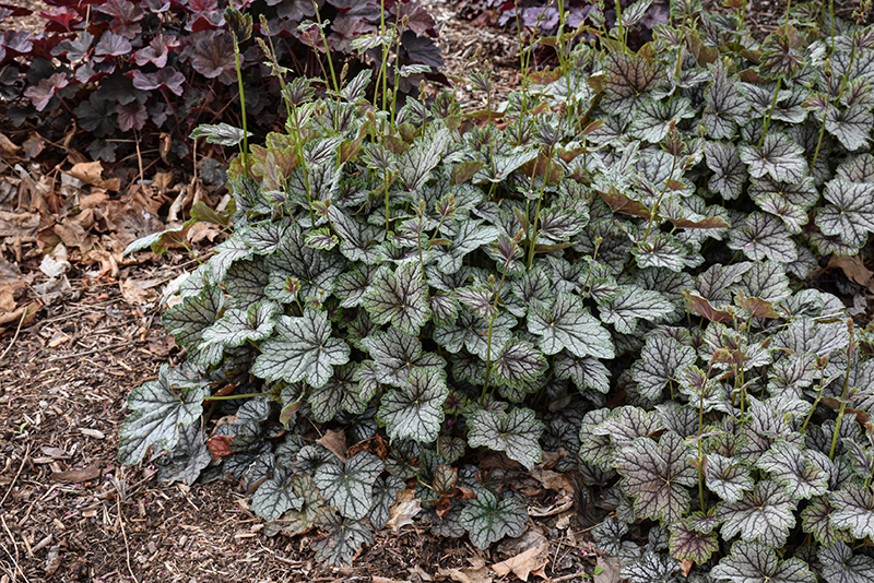 Hardiness Zone: 4a Other Names: Coralbells, Alumroot Description: Dramatic green foliage with deep red veins and silver overtones are featured on this compact variety; great for adding color and contrast in beds, borders, containers and rock gardens; small white flowers make an appearance in the early summer months Ornamental Features Green Spice Coral Bells features dainty spikes of creamy white bell-shaped flowers rising above the foliage from late spring to mid summer. Its attractive crinkled lobed leaves remain emerald green in color with distinctive dark red veins and tinges of silver throughout the year. Landscape Attributes Green Spice Coral Bells is a dense herbaceous evergreen perennial with tall flower stalks held atop a low mound of foliage. Its relatively fine texture sets it apart from other garden plants with less refined foliage. This is a relatively low maintenance plant, and should be cut back in late fall in preparation for winter. It is a good choice for attracting hummingbirds to your yard. It has no significant negative characteristics. Green Spice Coral Bells is recommended for the following landscape applications; Planting & Growing Green Spice Coral Bells will grow to be about 10 inches tall at maturity extending to 24 inches tall with the flowers, with a spread of 12 inches. When grown in masses or used as a bedding plant, individual plants should be spaced approximately 10 inches apart. Its foliage tends to remain low and dense right to the ground. It grows at a medium rate, and under ideal conditions can be expected to live for approximately 10 years. As an evegreen perennial, this plant will typically keep its form and foliage year-round. This plant performs well in both full sun and full shade. However, you may want to keep it away from hot, dry locations that receive direct afternoon sun or which get reflected sunlight, such as against the south side of a white wall. It prefers to grow in average to moist conditions, and shouldn't be allowed to dry out. It is not particular as to soil type or pH. It is somewhat tolerant of urban pollution. Consider covering it with a thick layer of mulch in winter to protect it in exposed locations or colder microclimates. This particular variety is an interspecific hybrid. It can be propagated by division; however, as a cultivated variety, be aware that it may be subject to certain restrictions or prohibitions on propagation. Green Spice Coral Bells is a fine choice for the garden, but it is also a good selection for planting in outdoor pots and containers. With its upright habit of growth, it is best suited for use as a 'thriller' in the 'spiller-thriller-filler' container combination; plant it near the center of the pot, surrounded by smaller plants and those that spill over the edges. Note that when growing plants in outdoor containers and baskets, they may require more frequent waterings than they would in the yard or garden.