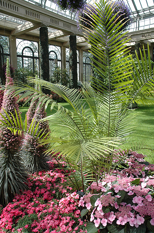 Hardiness Zone: 9b Other Names: Majestic Palm Description: A shade tolerant palm that thrives well under a canopy of tall trees, can adjust to light levels; grows very quickly and is tolerant of different soil types; must be fertilized frequently; an attractive, symmetrical plant, perfect as a landscape accent Ornamental Features Majesty Palm is primarily valued in the landscape for its canopy of attractive foliage which towers high above the ground. It is draped in stunning panicles of white flowers hanging below the branches in late spring. It has attractive green evergreen foliage. The narrow pinnately compound leaves are highly ornamental and remain green throughout the winter. The smooth gray bark is extremely showy and adds significant winter interest. Landscape Attributes Majesty Palm is an evergreen tree with a strong central leader and a towering form, with a high canopy of foliage concentrated at the top of the plant. Its relatively fine texture sets it apart from other landscape plants with less refined foliage. This is a relatively low maintenance tree, and may require the occasional pruning to look its best. Gardeners should be aware of the following characteristic(s) that may warrant special consideration; Majesty Palm is recommended for the following landscape applications; Planting & Growing Majesty Palm will grow to be about 20 feet tall at maturity, with a spread of 10 feet. It has a high canopy with a typical clearance of 6 feet from the ground, and is suitable for planting under power lines. As it matures, the lower branches of this tree can be strategically removed to create a high enough canopy to support unobstructed human traffic underneath. It grows at a fast rate, and under ideal conditions can be expected to live for approximately 20 years. This is a dioecious species, meaning that individual plants are either male or female. Only the females will produce fruit, and a male variety of the same species is required nearby as a pollinator. This tree does best in partial shade to shade. It does best in average to evenly moist conditions, but will not tolerate standing water. It is not particular as to soil pH, but grows best in rich soils. It is somewhat tolerant of urban pollution. This species is not originally from North America.. Majesty Palm is a fine choice for the yard, but it is also a good selection for planting in outdoor pots and containers. Because of its height, it is often used as a 'thriller' in the 'spiller-thriller-filler' container combination; plant it near the center of the pot, surrounded by smaller plants and those that spill over the edges. It is even sizeable enough that it can be grown alone in a suitable container. Note that when grown in a container, it may not perform exactly as indicated on the tag - this is to be expected. Also note that when growing plants in outdoor containers and baskets, they may require more frequent waterings than they would in the yard or garden.