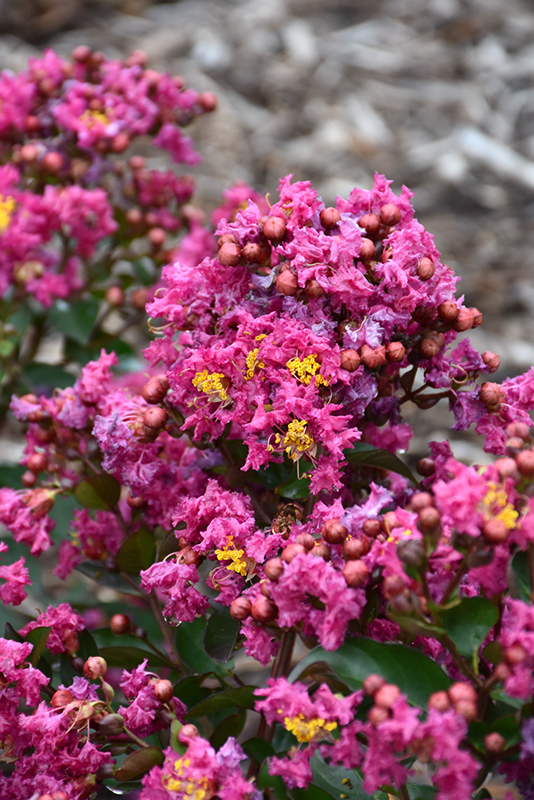 Hardiness Zone: 6a Other Names: Crape Myrtle, Crepe Myrtle Group/Class: Barista Collection Brand: Walters Gardens Description: This exciting ornamental shrub or small tree produces volumes of vibrant, frilly, raspberry purple blooms in late summer; a captivating focal point for the garden or border; mature heights will be taller in southern climates; blooms on new wood Ornamental Features Barista® Spiced Plum Crapemyrtle is clothed in stunning panicles of hot pink frilly flowers with purple overtones and yellow anthers at the ends of the branches from late summer to early fall, which emerge from distinctive rose flower buds. It has attractive dark green foliage with hints of olive green. The oval leaves are highly ornamental and turn red in fall. The fruits are showy green pods displayed from mid fall to early winter. Landscape Attributes Barista® Spiced Plum Crapemyrtle is a dense multi-stemmed deciduous shrub with an upright spreading habit of growth. Its relatively fine texture sets it apart from other landscape plants with less refined foliage. This is a relatively low maintenance shrub, and is best pruned in late winter once the threat of extreme cold has passed. It is a good choice for attracting bees to your yard, but is not particularly attractive to deer who tend to leave it alone in favor of tastier treats. It has no significant negative characteristics. Barista® Spiced Plum Crapemyrtle is recommended for the following landscape applications; Planting & Growing Barista® Spiced Plum Crapemyrtle will grow to be about 30 inches tall at maturity, with a spread of 30 inches. It has a low canopy. It grows at a fast rate, and under ideal conditions can be expected to live for 50 years or more. This shrub does best in full sun to partial shade. It prefers to grow in average to moist conditions, and shouldn't be allowed to dry out. It is very fussy about its soil conditions and must have rich, acidic soils to ensure success, and is subject to chlorosis (yellowing) of the foliage in alkaline soils. It is highly tolerant of urban pollution and will even thrive in inner city environments. This particular variety is an interspecific hybrid.