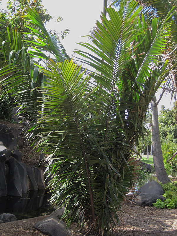 Hardiness Zone: 10b Other Names: Colenda Oil Palm Description: An absolutely stunning palm that is rare in cultivation; distinguished because it self-cleans by shedding dead leaves; use as a large landscape accent or avenue tree in frost free climates Ornamental Features Chivila Palm has attractive dark green evergreen foliage on a tree with the bulk of the canopy held atop a towering trunk or stem. The large glossy narrow pinnately compound leaves are highly ornamental and remain dark green throughout the winter. The rough gray bark is extremely showy and adds significant winter interest. Landscape Attributes Chivila Palm is an open evergreen tree with a strong central leader and a towering form, with a high canopy of foliage concentrated at the top of the plant. Its average texture blends into the landscape, but can be balanced by one or two finer or coarser trees or shrubs for an effective composition. This is a relatively low maintenance tree, and usually looks its best without pruning, although it will tolerate pruning. It has no significant negative characteristics. Chivila Palm is recommended for the following landscape applications; Planting & Growing Chivila Palm will grow to be about 80 feet tall at maturity, with a spread of 40 feet. It has a high canopy of foliage that sits well above the ground, and should not be planted underneath power lines. As it matures, the lower branches of this tree can be strategically removed to create a high enough canopy to support unobstructed human traffic underneath. It grows at a medium rate, and under ideal conditions can be expected to live to a ripe old age of 150 years or more; think of this as a heritage tree for future generations! This tree should only be grown in full sunlight. It does best in average to evenly moist conditions, but will not tolerate standing water. It is not particular as to soil type or pH. It is somewhat tolerant of urban pollution. This species is not originally from North America..