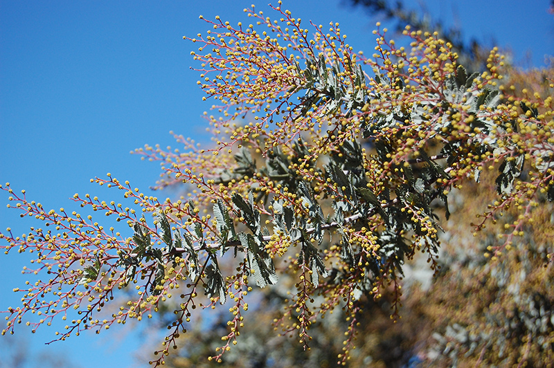Hardiness Zone: 9a Other Names: Cootamundra Wattle, Bailey's Acacia, Golden Mimosa Description: A large, graceful shrub or small tree with a wide spreading canopy; feathery, lavender-purple new foliage matures to blue-gray; fragrant pea-like, golden-yellow flowers appear in late winter to spring; drought tolerant once established Ornamental Features Purple Fernleaf Acacia features showy racemes of fragrant yellow ball-shaped flowers along the branches from late winter to early spring. It has attractive powder blue foliage with hints of silver which emerges purple in spring. The tiny narrow bipinnately compound leaves are highly ornamental and remain powder blue throughout the winter. The fruits are showy brown pods displayed from mid summer to mid fall. Landscape Attributes Purple Fernleaf Acacia is a multi-stemmed evergreen tree with a shapely form and gracefully arching branches. Its relatively fine texture sets it apart from other landscape plants with less refined foliage. This is a relatively low maintenance tree, and should only be pruned after flowering to avoid removing any of the current season's flowers. It is a good choice for attracting birds, bees and butterflies to your yard, but is not particularly attractive to deer who tend to leave it alone in favor of tastier treats. Gardeners should be aware of the following characteristic(s) that may warrant special consideration; Purple Fernleaf Acacia is recommended for the following landscape applications; Planting & Growing Purple Fernleaf Acacia will grow to be about 25 feet tall at maturity, with a spread of 25 feet. It has a low canopy with a typical clearance of 1 foot from the ground, and is suitable for planting under power lines. It grows at a fast rate, and under ideal conditions can be expected to live for approximately 30 years. This tree does best in full sun to partial shade. It does best in average to evenly moist conditions, but will not tolerate standing water. It is not particular as to soil pH, but grows best in sandy soils. It is somewhat tolerant of urban pollution. This is a selected variety of a species not originally from North America.; however, as a cultivated variety, be aware that it may be subject to certain restrictions or prohibitions on propagation.