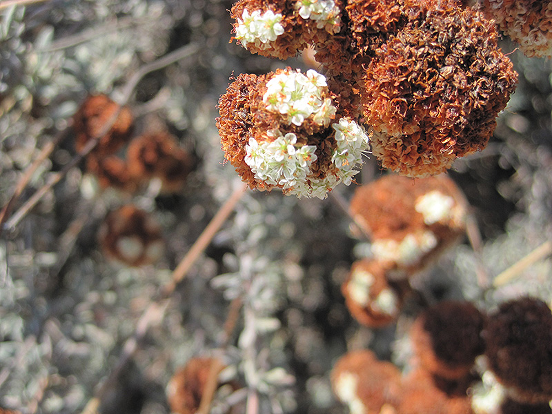 Hardiness Zone: 7b Other Names: Leafy California Buckwheat, Wild Buckwheat Description: A tough, attractive plant for use in low maintenance landscaping or xeriscaping; a native shrub, producing white flower clusters in spring that turn pink, then rust colored in summer and fall, persisting for a long time; excellent for naturalizing Ornamental Features Eastern Mojave Buckwheat features showy clusters of white flowers with shell pink overtones rising above the foliage from late spring to late fall, which emerge from distinctive scarlet flower buds. The flowers are excellent for cutting. It has green deciduous foliage. The tiny narrow leaves do not develop any appreciable fall color. The twisted dark gray bark and brick red branches add an interesting dimension to the landscape. Landscape Attributes Eastern Mojave Buckwheat is a dense multi-stemmed deciduous shrub with a mounded form. Its relatively fine texture sets it apart from other landscape plants with less refined foliage. This is a relatively low maintenance shrub, and should only be pruned after flowering to avoid removing any of the current season's flowers. It is a good choice for attracting birds, bees and butterflies to your yard. Gardeners should be aware of the following characteristic(s) that may warrant special consideration; Eastern Mojave Buckwheat is recommended for the following landscape applications; Planting & Growing Eastern Mojave Buckwheat will grow to be about 4 feet tall at maturity, with a spread of 5 feet. It tends to fill out right to the ground and therefore doesn't necessarily require facer plants in front. It grows at a slow rate, and under ideal conditions can be expected to live for approximately 20 years. As this plant tends to go dormant in summer, it is best interplanted with late-season bloomers to hide the dying foliage. This shrub does best in full sun to partial shade. It prefers dry to average moisture levels with very well-drained soil, and will often die in standing water. It is considered to be drought-tolerant, and thus makes an ideal choice for xeriscaping or the moisture-conserving landscape. It is not particular as to soil pH, but grows best in poor soils, and is able to handle environmental salt. It is highly tolerant of urban pollution and will even thrive in inner city environments. This species is native to parts of North America..