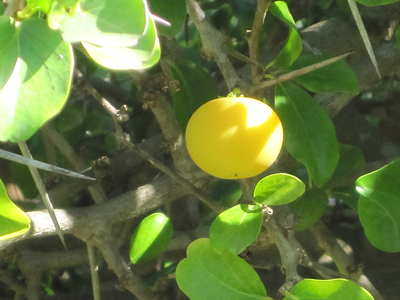 Hardiness Zone: 9b Description: A wonderful drought resistant, upright growing fruit tree with a densely branched crown; can be grown as hedges when planted close together; produces round, yellow fruit with a juicy, slightly acid flavor, ideal for jams, jellies, and preserves Edible Qualities Kei Apple is a large shrub that is typically grown for its edible qualities. It produces yellow round fruit with yellow flesh which are typically harvested when mature. The fruits have a tart taste with a juicy texture and a light fragrance. The fruit are most often used in the following ways: Features & Attributes Kei Apple features showy clusters of creamy white flowers with light green overtones at the ends of the branches from early to late spring. It has green deciduous foliage. The large glossy oval leaves do not develop any appreciable fall color. This is a multi-stemmed deciduous shrub with an upright spreading habit of growth. Its relatively coarse texture can be used to stand it apart from other landscape plants with finer foliage. This is a relatively low maintenance plant, and can be pruned at anytime. It is a good choice for attracting birds, bees and butterflies to your yard. It has no significant negative characteristics. Aside from its primary use as an edible, Kei Apple is sutiable for the following landscape applications; Planting & Growing Kei Apple will grow to be about 19 feet tall at maturity, with a spread of 12 feet. It has a low canopy with a typical clearance of 5 feet from the ground, and is suitable for planting under power lines. It grows at a medium rate, and under ideal conditions can be expected to live for 40 years or more. This is a dioecious species, meaning that individual plants are either male or female. Only the females will produce fruit, and a male variety of the same species is required nearby as a pollinator. This plant is typically grown in a designated edibles garden. It does best in full sun to partial shade. It prefers dry to average moisture levels with very well-drained soil, and will often die in standing water. It is considered to be drought-tolerant, and thus makes an ideal choice for xeriscaping or the moisture-conserving landscape. It is not particular as to soil type or pH. It is somewhat tolerant of urban pollution. Consider applying a thick mulch around the root zone in winter to protect it in exposed locations or colder microclimates. This species is not originally from North America..