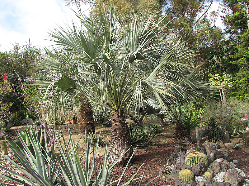 Hardiness Zone: 9a Other Names: Blue Sonora Fan Palm Description: This graceful variety features icy blue-green leaves with a distinctly droopy character; this variant is vigorous and faster growing; persistent leaves should be trimmed away; tolerant of warm, humid conditions; a great addition to the tropical landscape Ornamental Features Blue Sonora Hesper Palm is draped in stunning clusters of creamy white flowers with chartreuse overtones hanging below the branches from mid to late winter. It has attractive grayish green foliage with hints of silvery blue. The large fan-shaped palmate leaves are highly ornamental and remain grayish green throughout the winter. The gold fruits are held in abundance in spectacular clusters from early to mid summer. The fruit can be messy if allowed to drop on the lawn or walkways, and may require occasional clean-up. The rough dark brown bark is extremely showy and adds significant winter interest. Landscape Attributes Blue Sonora Hesper Palm is an open evergreen tree with a strong central leader and a towering form, with a high canopy of foliage concentrated at the top of the plant. Its average texture blends into the landscape, but can be balanced by one or two finer or coarser trees or shrubs for an effective composition. This is a relatively low maintenance tree, and usually looks its best without pruning, although it will tolerate pruning. It has no significant negative characteristics. Blue Sonora Hesper Palm is recommended for the following landscape applications; Planting & Growing Blue Sonora Hesper Palm will grow to be about 20 feet tall at maturity, with a spread of 15 feet. It has a low canopy with a typical clearance of 3 feet from the ground, and is suitable for planting under power lines. It grows at a medium rate, and under ideal conditions can be expected to live to a ripe old age of 150 years or more; think of this as a heritage tree for future generations! This tree should only be grown in full sunlight. It is very adaptable to both dry and moist growing conditions, but will not tolerate any standing water. It is very fussy about its soil conditions and must have sandy, acidic soils to ensure success, and is subject to chlorosis (yellowing) of the foliage in alkaline soils. It is somewhat tolerant of urban pollution. This species is not originally from North America.