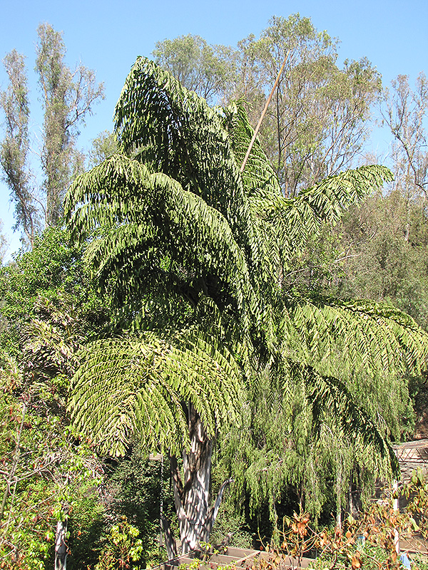 Hardiness Zone: 9a Other Names: Jaggery Palm, Solitary Fishtail Palm, Kitul Palm Description: This beautiful palm forms a tall single trunk, topped with large, evenly spaced, dull green bi-pinnate leaves, creating a stunning lacey pattern; flowers and fruits only once, then dies; provide adequate space, as it grows quite large and extremely fast Ornamental Features Toddy Fishtail Palm has attractive green evergreen foliage on a tree with the bulk of the canopy held atop a towering trunk or stem. The enormous fan-shaped bipinnately compound leaves are highly ornamental and remain green throughout the winter. It is draped in stunning clusters of buttery yellow flowers hanging below the branches from early to mid summer. The lime green fruits with a red blush and which fade to burgundy over time are held in clusters from early to mid fall. The smooth gray bark is extremely showy and adds significant winter interest. Landscape Attributes Toddy Fishtail Palm is an evergreen tree with a strong central leader and a towering form, with a high canopy of foliage concentrated at the top of the plant. Its relatively coarse texture can be used to stand it apart from other landscape plants with finer foliage. This is a high maintenance tree that will require regular care and upkeep, and should not require much pruning, except when necessary, such as to remove dieback. Gardeners should be aware of the following characteristic(s) that may warrant special consideration; Toddy Fishtail Palm is recommended for the following landscape applications; Planting & Growing Toddy Fishtail Palm will grow to be about 80 feet tall at maturity, with a spread of 30 feet. It has a high canopy of foliage that sits well above the ground, and should not be planted underneath power lines. As it matures, the lower branches of this tree can be strategically removed to create a high enough canopy to support unobstructed human traffic underneath. It grows at a fast rate, and under ideal conditions can be expected to live for approximately 25 years. This tree does best in full sun to partial shade. It does best in average to evenly moist conditions, but will not tolerate standing water. It is not particular as to soil pH, but grows best in rich soils. It is somewhat tolerant of urban pollution, and will benefit from being planted in a relatively sheltered location. This species is not originally from North America, and parts of it are known to be toxic to humans and animals, so care should be exercised in planting it around children and pets.. Toddy Fishtail Palm is a fine choice for the yard, but it is also a good selection for planting in outdoor pots and containers. Because of its height, it is often used as a 'thriller' in the 'spiller-thriller-filler' container combination; plant it near the center of the pot, surrounded by smaller plants and those that spill over the edges. It is even sizeable enough that it can be grown alone in a suitable container. Note that when grown in a container, it may not perform exactly as indicated on the tag - this is to be expected. Also note that when growing plants in outdoor containers and baskets, they may require more frequent waterings than they would in the yard or garden.