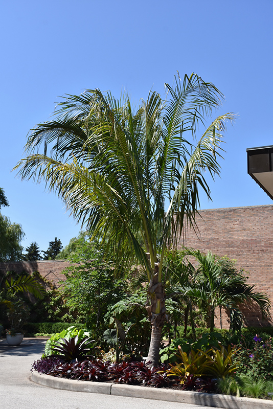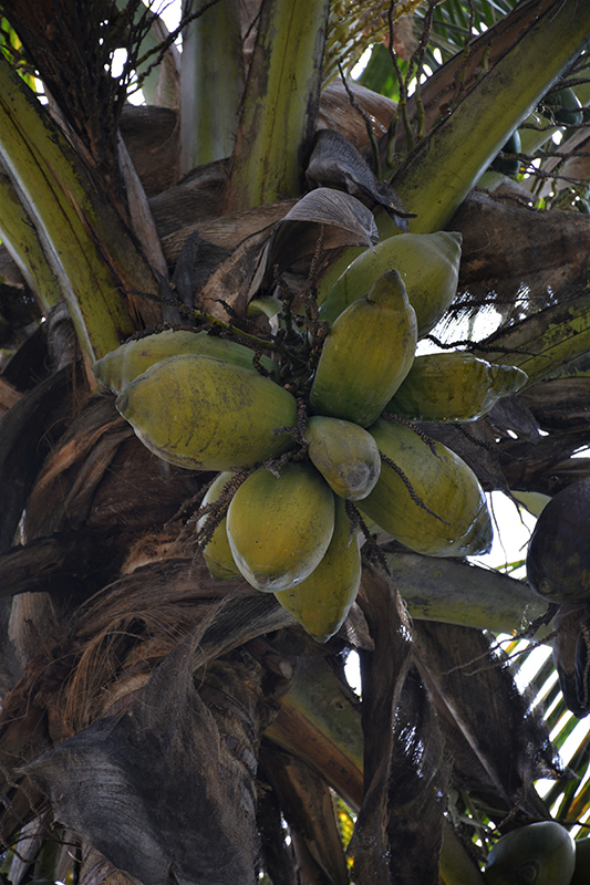 Hardiness Zone: 10b Description: A tall palm, native to the Western Pacific, but grown in frost free areas around the world; a single trunked variety crowned with downward arching green fronds; fragrant yellow flowers may appear year round, followed by edible fruits Ornamental Features Coconut Palm has clusters of fragrant yellow flowers hanging below the branches from mid to early winter. It has attractive dark green evergreen foliage. The large glossy narrow pinnately compound leaves are highly ornamental and remain dark green throughout the winter. The fruits are showy green drupes which fade to brown over time, which are carried in abundance from mid to early winter. The fruit can be messy if allowed to drop on the lawn or walkways, and may require occasional clean-up. The smooth gray bark is extremely showy and adds significant winter interest. Landscape Attributes Coconut Palm is an open evergreen tree with a strong central leader and a towering form, with a high canopy of foliage concentrated at the top of the plant. Its relatively fine texture sets it apart from other landscape plants with less refined foliage. This is a high maintenance tree that will require regular care and upkeep, and should not require much pruning, except when necessary, such as to remove dieback. It is a good choice for attracting birds, bees and butterflies to your yard. Gardeners should be aware of the following characteristic(s) that may warrant special consideration; Coconut Palm is recommended for the following landscape applications; Planting & Growing Coconut Palm will grow to be about 70 feet tall at maturity, with a spread of 35 feet. It has a high canopy of foliage that sits well above the ground, and should not be planted underneath power lines. As it matures, the lower branches of this tree can be strategically removed to create a high enough canopy to support unobstructed human traffic underneath. It grows at a slow rate, and under ideal conditions can be expected to live for 60 years or more. This is a self-pollinating variety, so it doesn't require a second plant nearby to set fruit. This tree should only be grown in full sunlight. It does best in average to evenly moist conditions, but will not tolerate standing water. It is not particular as to soil pH, but grows best in rich soils, and is able to handle environmental salt. It is somewhat tolerant of urban pollution. This species is not originally from North America..